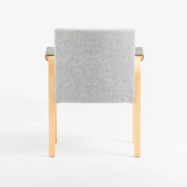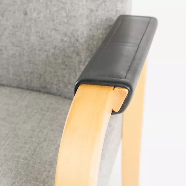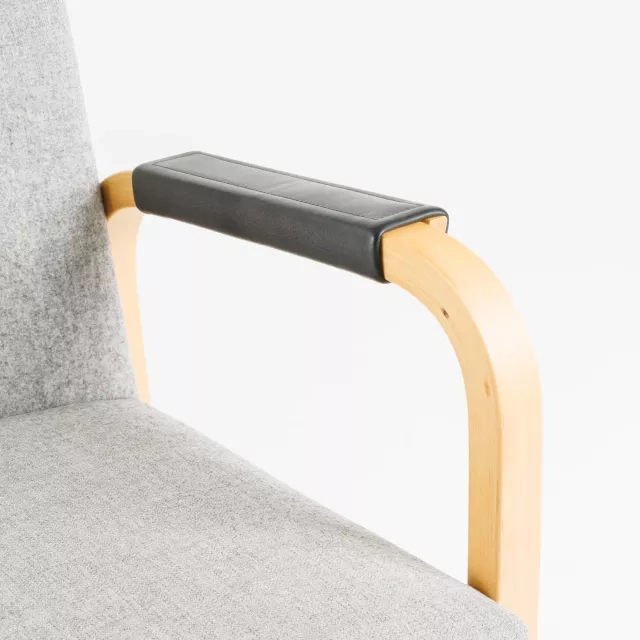 Karmstolen modell 46 från Artek, designad av den berömda Alvar Aalto, utgör en tidlös del i hållbart kontorsmöblemang. Tillverkad 2005 av formpressad björk, erbjuder denna karmstol en helklädd sits och rygg för både hållbarhet och elegans. Förbättrad med läderskonade armstöd, kombinerar den klassisk design med modern komfort, lämplig för olika professionella miljöer.
