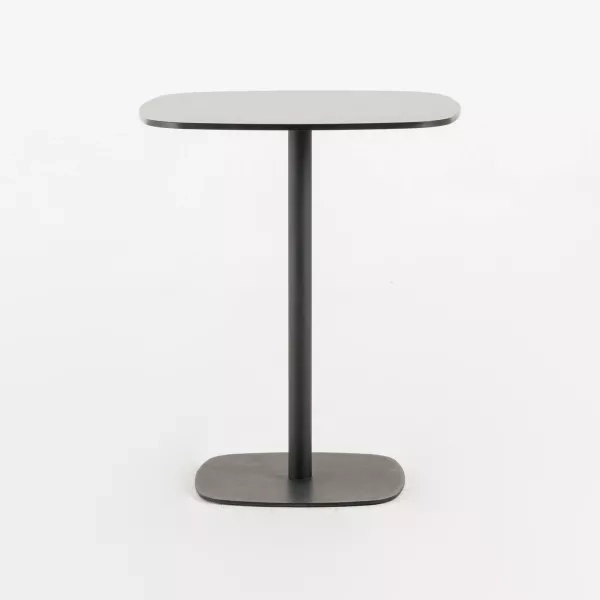 Cafébordet från Blå Station är ett elegant val för mångsidiga miljöer som matsalar, mötesrum och kaféer. Det har en kvadratisk vit bordsskiva med distinkta svarta kanter och står på ett robust silvergrått aluminiumstativ, vilket erbjuder både funktionalitet och stil.