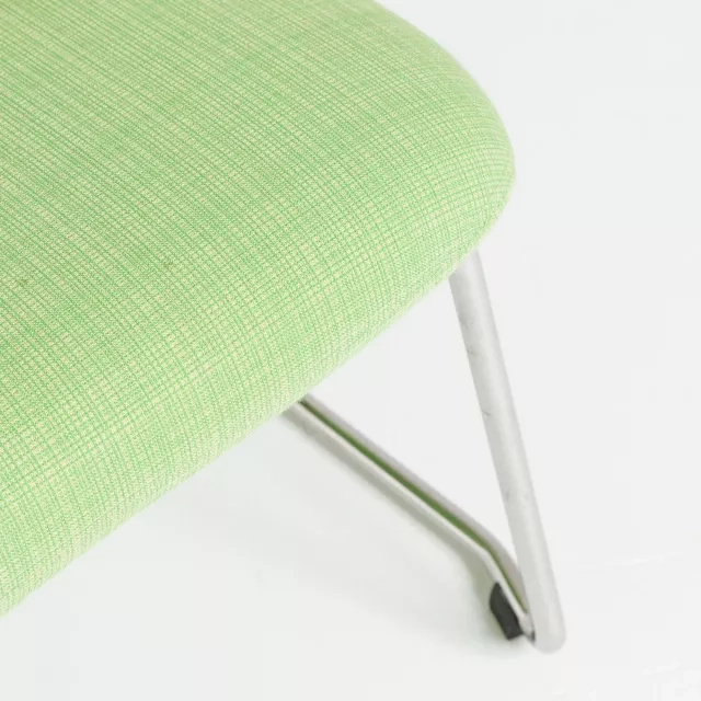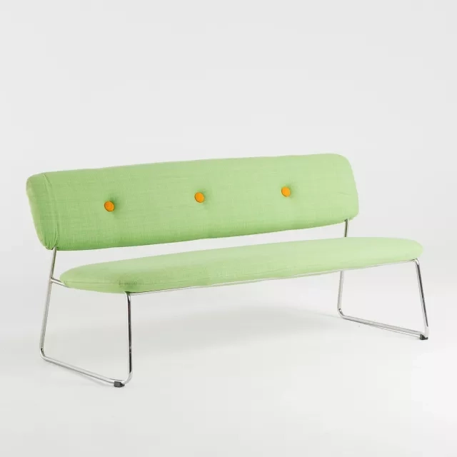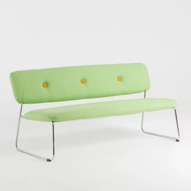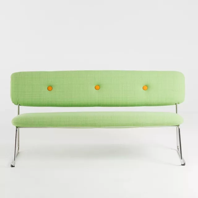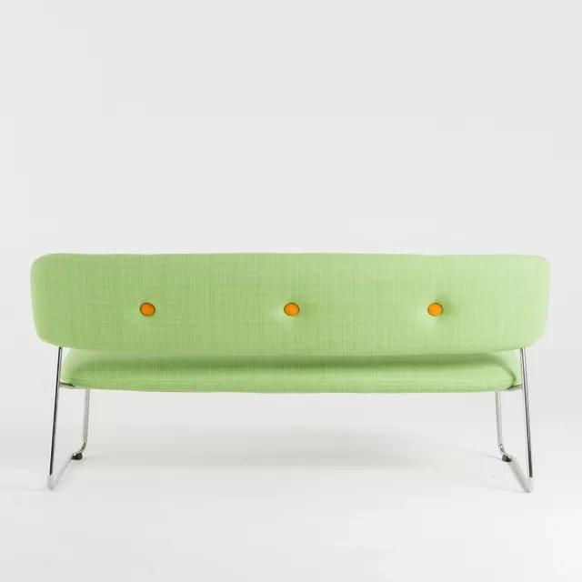 Den återbrukade 2-sitssoffan Dundra från Blå Station, formgiven av Stefan Borselius år 2011, är ett elegant och praktiskt val för olika professionella miljöer. Med sitt kromade stålstativ och klädda, formgjutna sitsar, återspeglar denna soffa både designerens kreativitet och ett engagemang för hållbarhet. Lämplig för platser som restauranger, hotell eller bibliotek, har soffan tre distinkta orangea ryggknappar mot det ljusare gröna tyget, vilket bidrar till dess distinkta uttryck.