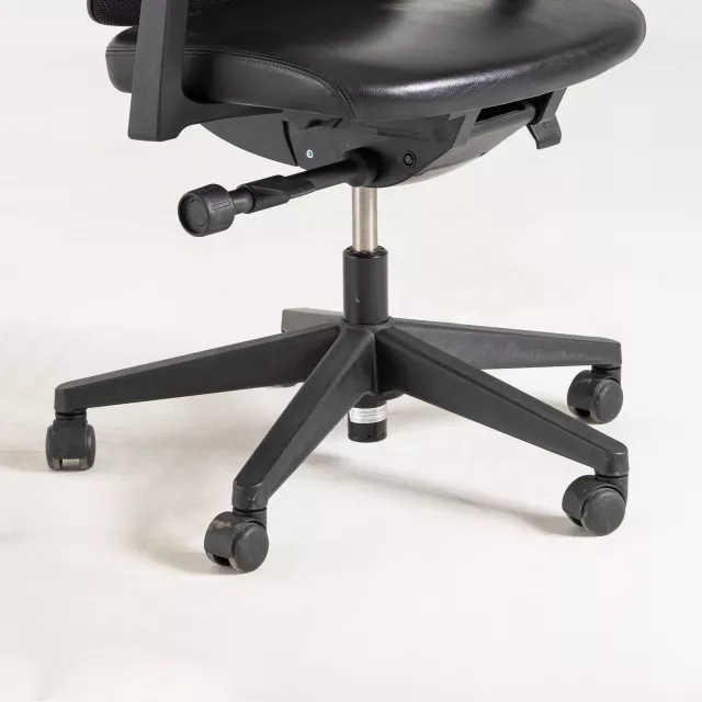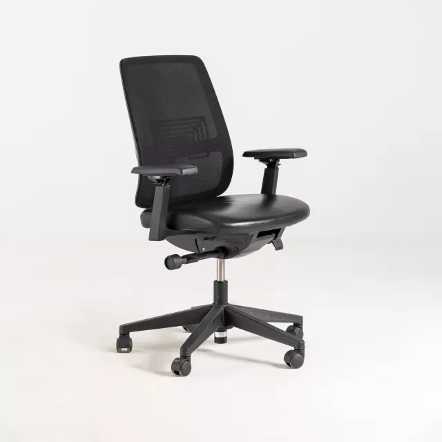 Lively er en kontorstol fra varemærket Haworth med enkle justeringer for en stabil siddestilling. Meshryggen fremmer luftgennemstrømning og reducerer risikoen for varmeopbygning under længere perioder. Lædersædet giver holdbar støtte, der egner sig til hyppig brug i aktivitetsbaserede miljøer. De letforståelige betjeningsgreb gør det nemt at indstille stolen ved delte skriveborde.