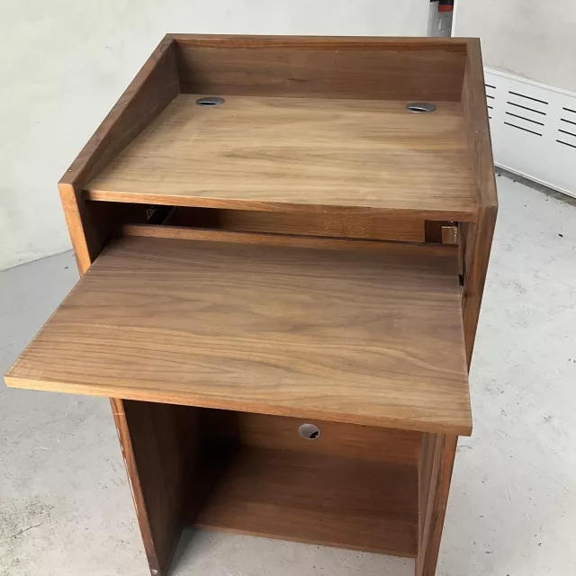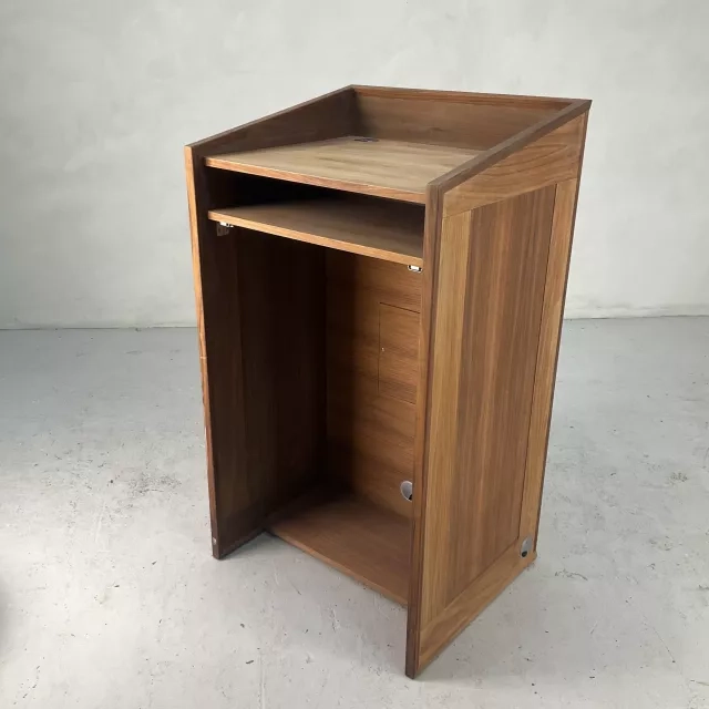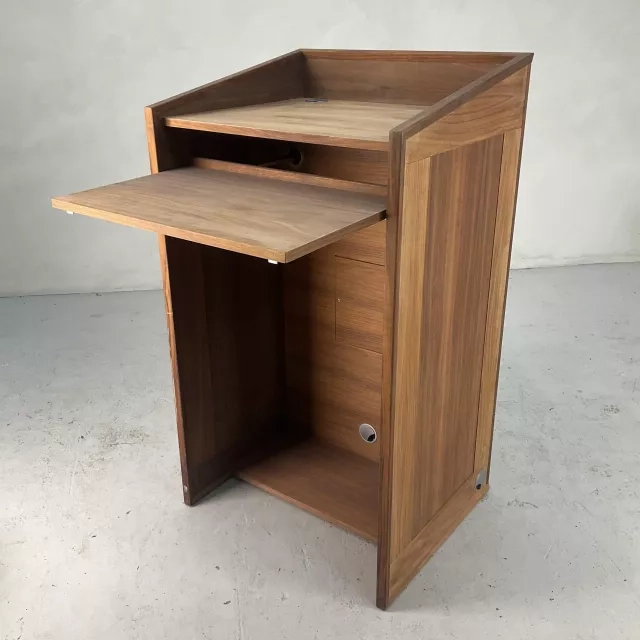 Nå ud med dine idéer med denne højkvalitets talerstol i teaktræ. Fremstillet helt i robust teaktræ er denne pult designet til professionelle miljøer, hvor kvalitet og funktion er i fokus. Den udtrækkelige bordplade giver ekstra plads til bærbar computer eller papirer, hvilket gør det lettere at holde en flydende præsentation. Efter ønske kan låsbare hjul monteres for at tilpasse mobiliteten til dine behov.