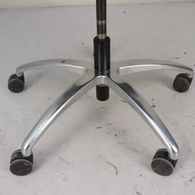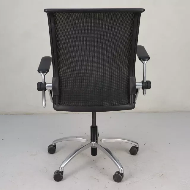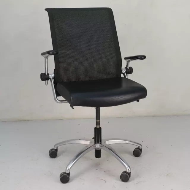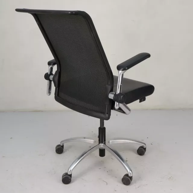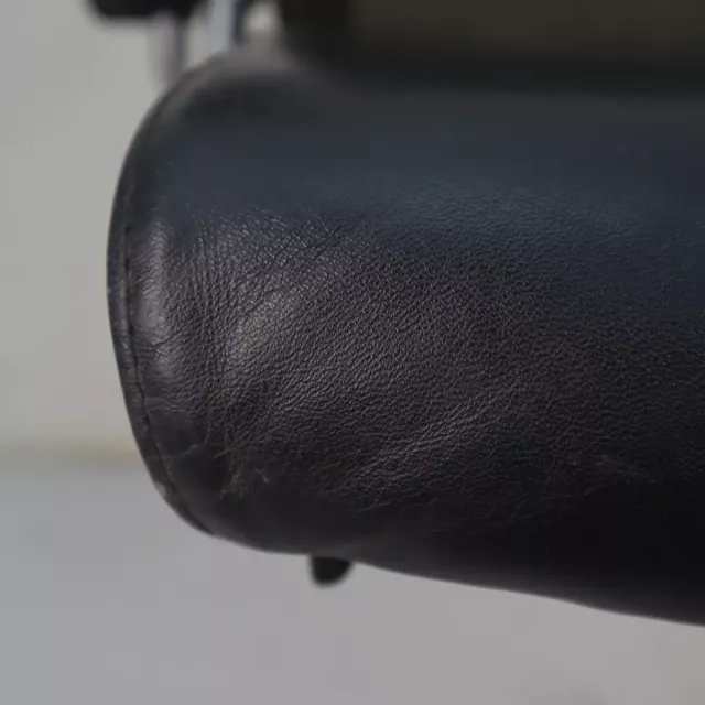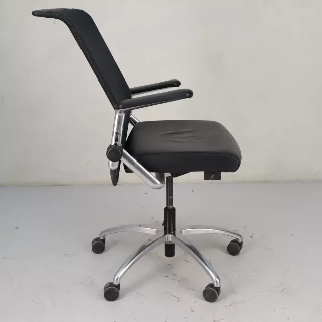 Den genbrugte, ergonomiske arbejdsstol Kineta fra det tyske mærke König+Neurath forener moderne design med funktionel tilpasningsevne til nutidens arbejdsmiljøer. Stolen har et elegant forkromet fodkryds og er højdejusterbar, med et luksuriøst sort lædersæde og en åndbar meshryg for komfort under lange arbejdsdage.