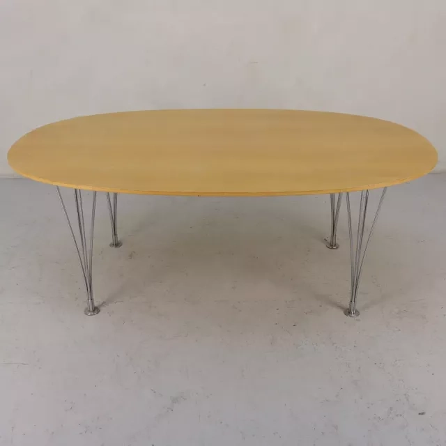 Det brugte sofabord Superellipse fra Fritz Hansen er et eksempel på tidløst design, udviklet af den ikoniske trio Piet Hein, Bruno Mathsson og Arne Jacobsen i 1968. Med sine elegante, forkromede spændben og den slidstærke bordplade i bøgefiner udstråler dette bord en kombination af elegance og funktion og passer godt i personalerum eller pauserum.
