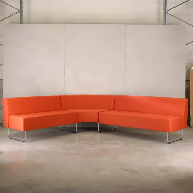 Det kromede medestel tilfører et strejf af elegance og modernitet til designet, hvilket gør sofaen til et passende indslag i alle professionelle miljøer. Sofaens genbrugte karakter vidner om en bevidsthed om bæredygtighed uden at gå på kompromis med kvalitet eller æstetisk appel. Denne hjørnesofa er designet til at løfte ethvert lounge- eller entréområde.