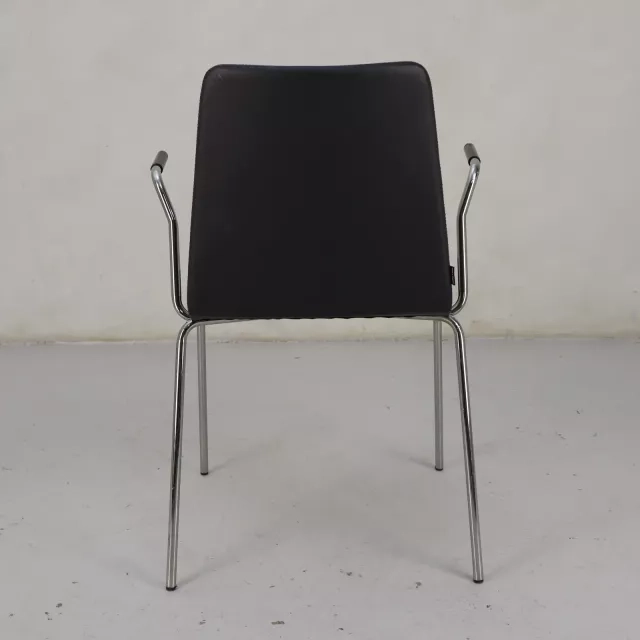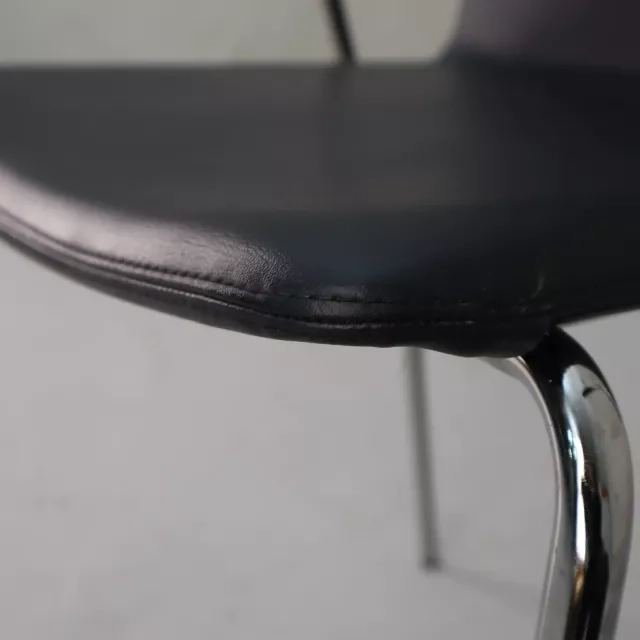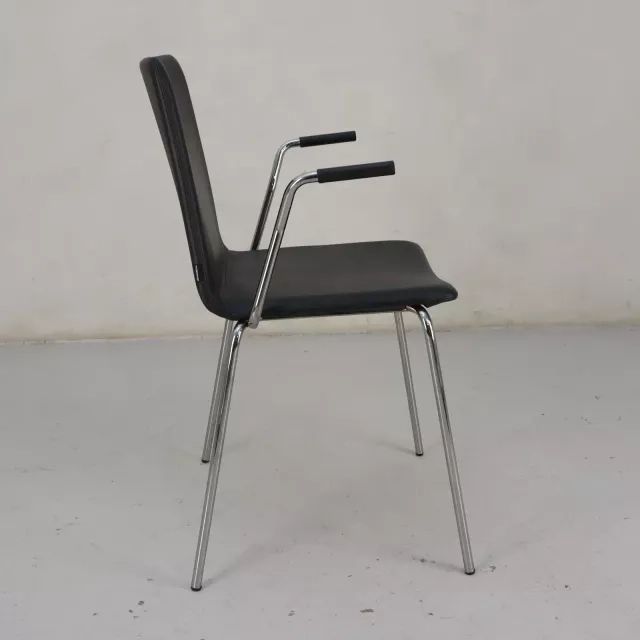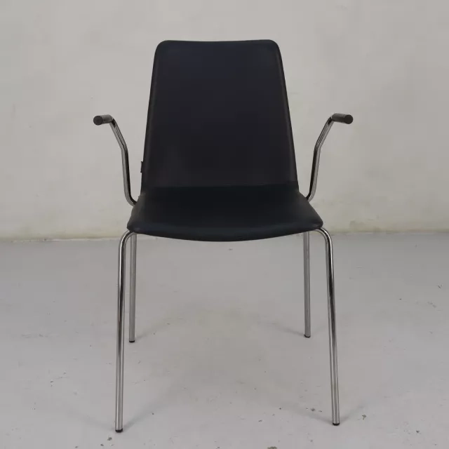Den stabelbare og genbrugte armstol Mind fra Johanson Design forener bæredygtigt design med moderne elegance. Helt beklædt i sort kunstlæder af høj kvalitet, tilbyder denne stol et sofistikeret udtryk, der egner sig til professionelle miljøer. Med stilrene, sølvfarvede metalben balancerer stolen mellem stil og holdbarhed til alsidig kontorbrug.