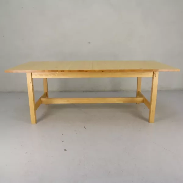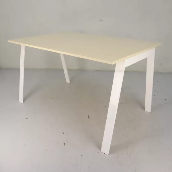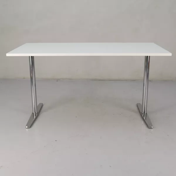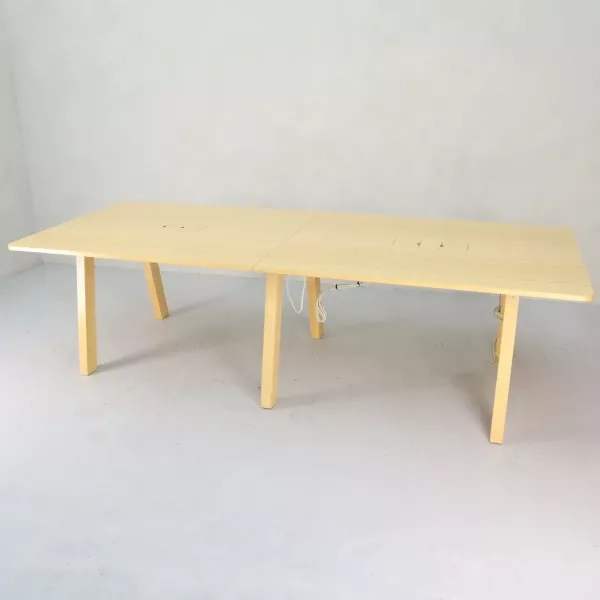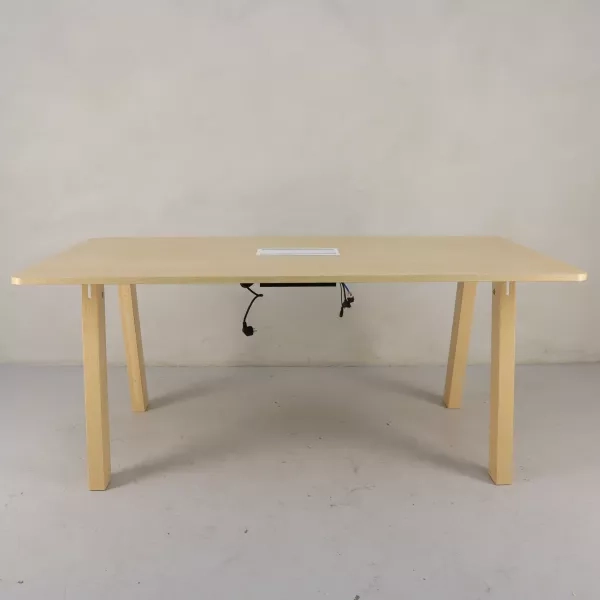 Dette innovative konferencebord i ståhøjde er et fremragende valg for moderne kontormiljøer, der søger funktionelle og tilpasningsdygtige møbelløsninger. Bordet har en hvid overflade med kabelgennemføring i lys ask, hvilket giver praktisk anvendelse uden at gå på kompromis med den æstetiske appel. Trods en mindre skønhedsfejl på undersiden er bordet i god stand og klar til øjeblikkelig brug.