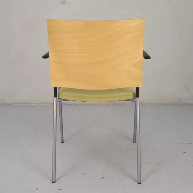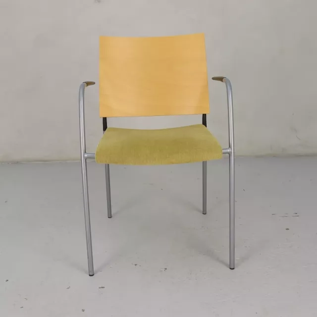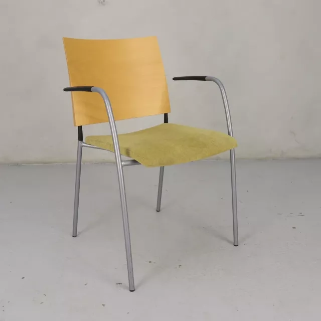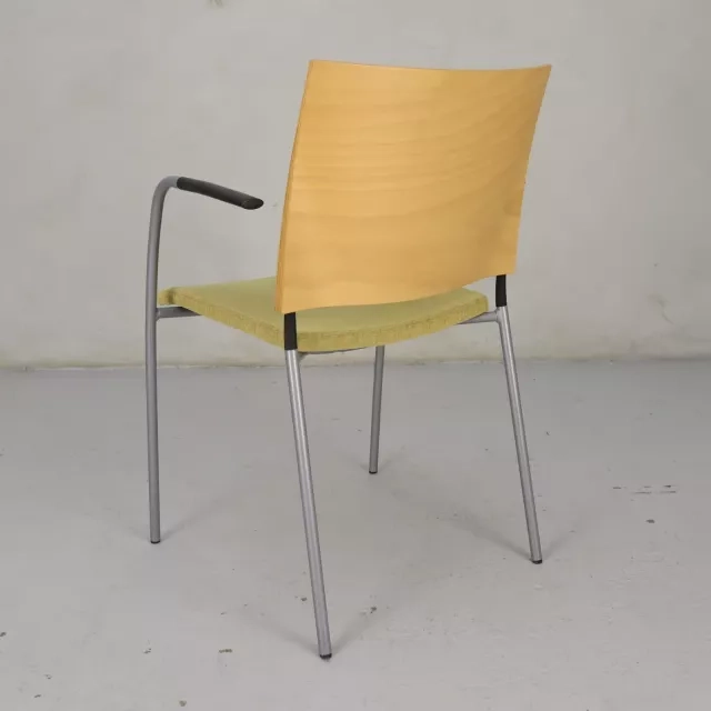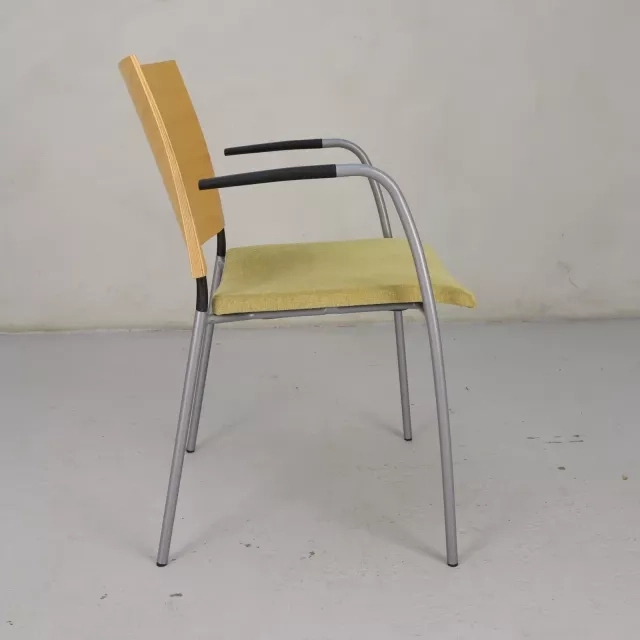 Genbrugt armstol Spira fra Lammhults, designet af Johannes Foersom & Peter Hiort-Lorenzen, forener moderne design med bæredygtighed. Med ryglæn i bøg og sæde betrukket med grønt stof passer denne højkvalitetsstol perfekt i møderum eller som besøgsstol. Dens robuste konstruktion garanterer både komfort og lang levetid.