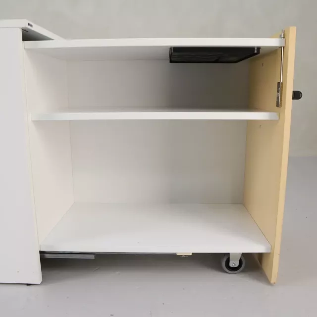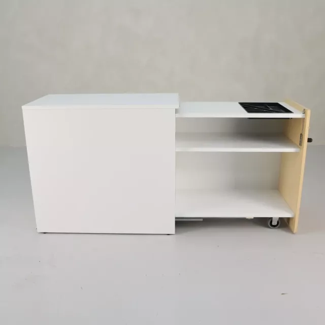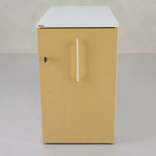 Det genbrugte towerskab fra Edsbyn tilbyder en stilren og bæredygtig løsning til at organisere dit kontor. Skabet kan placeres til højre for eller under skrivebordet, og dets udtræksfunktion maksimerer pladsen. Med plads til to ringbindshøjder sikrer skabet opbevaringen af vigtige dokumenter og er desuden låsbart for øget sikkerhed. Med sin hvide og birkefinish giver møblet et sofistikeret indtryk i alle professionelle miljøer.