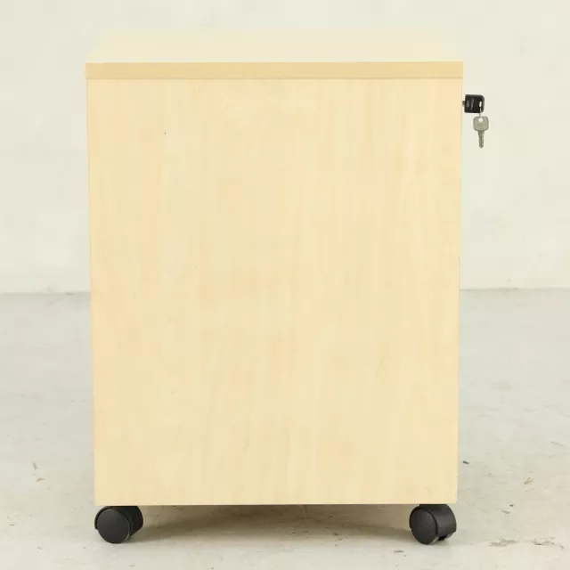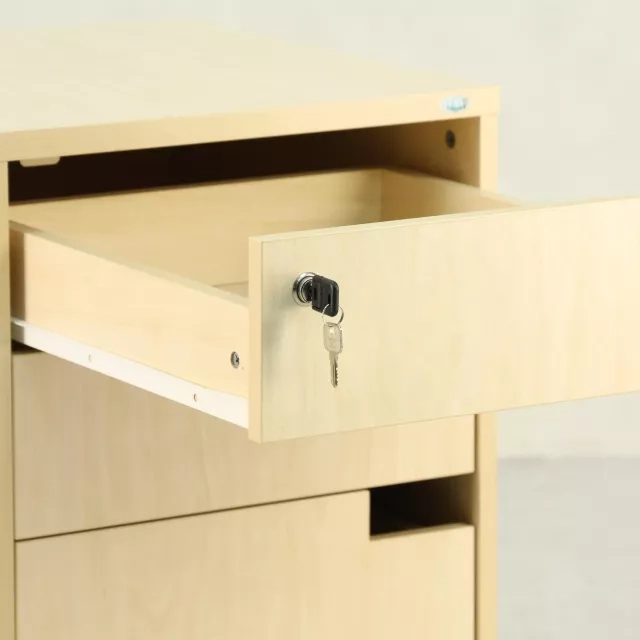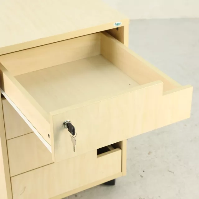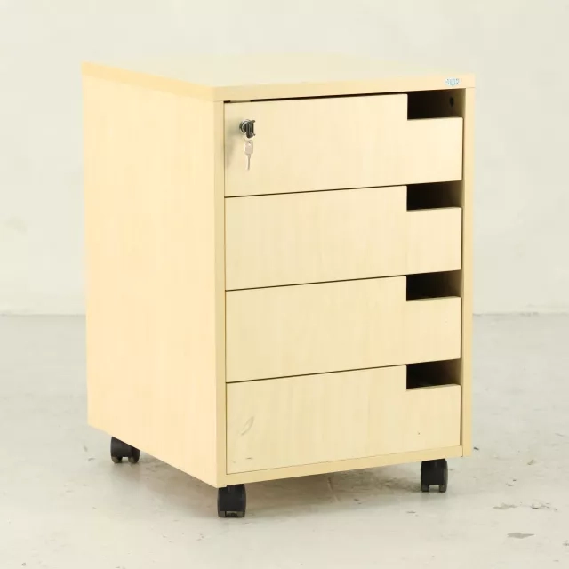 Denne genbrugte rullecontainer i birk tilbyder en praktisk opbevaringsløsning i kontormiljøet. Med fire rummelige udtræksskuffer er den øverste skuffe låsbar og leveres med nøgle, hvilket sikrer sikker opbevaring af vigtige dokumenter. Det mobile design muliggør fleksibel placering og gør den til et alsidigt supplement i alle arbejdsmiljøer.