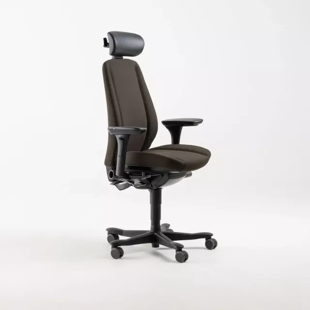 Kontorstolen 9000 fra Kinnarps, designet af Johan Larsvall & Torbjörn Höjer, tilbyder en pålidelig ergonomisk løsning til moderne arbejdsmiljøer. Fuldpolstret i et slidstærkt brunt stof med en nakkestøtte i sort læder, er denne stol udstyret til individuel komfort med justerbare armlæn og en tilpasningsbar nakkestøtte.