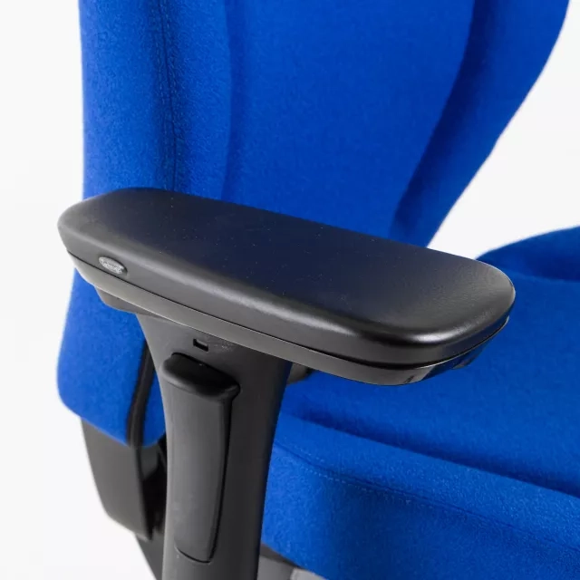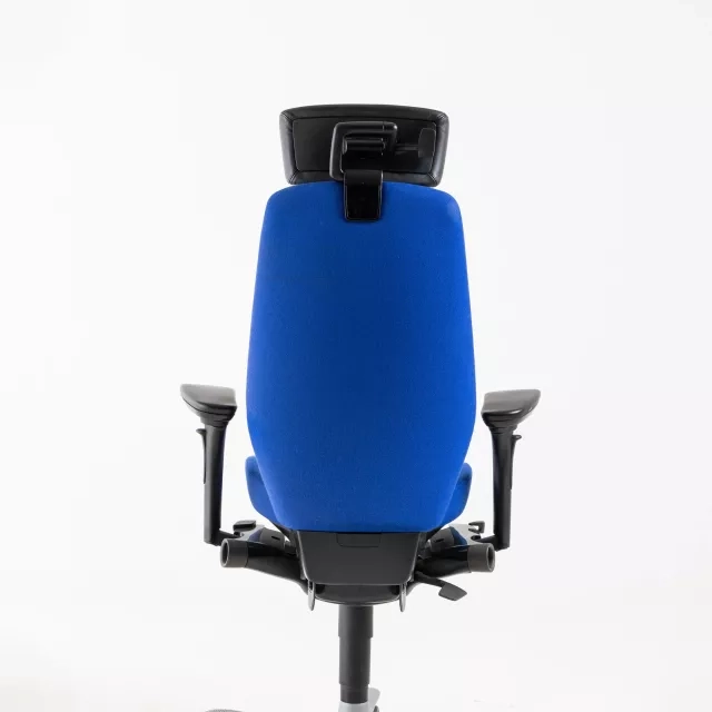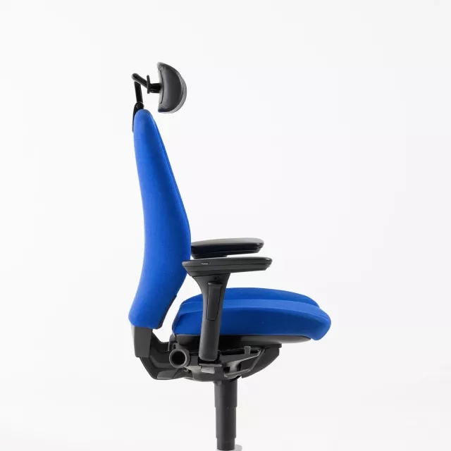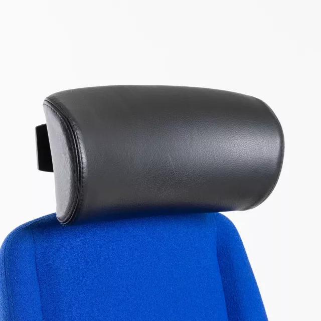 Den ergonomiske skrivebordsstol 9000 fra Kinnarps, designet af Johan Larsvall og Torbjörn Höjer, er en alsidig kontorstol, fuldt polstret i blåt stof med nakkestøtte i sort læder. Udstyret med justerbare armlæn og nakkestøtte tilbyder den en række tilpasningsmuligheder, der forbedrer ergonomien i ethvert arbejdsmiljø.