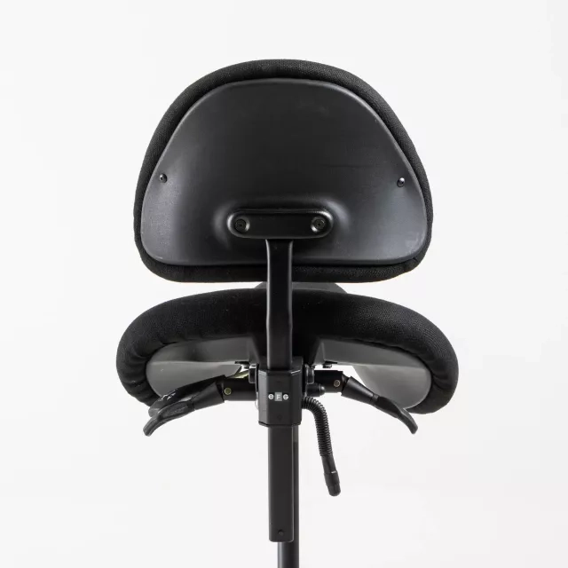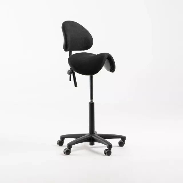 Denne ergonomiske sadelstol med hjul har et højdejusterbart sæde samt et justerbart ryglæn, hvilket gør den velegnet til forskellige arbejdsmiljøer. Det sorte stof giver et stilrent udtryk, der passer i sundhedssektoren, i skoler eller som en ekstra kontorstol. Stolen tilbyder komfort og støtte gennem hele arbejdsdagen takket være sine fleksible funktioner.