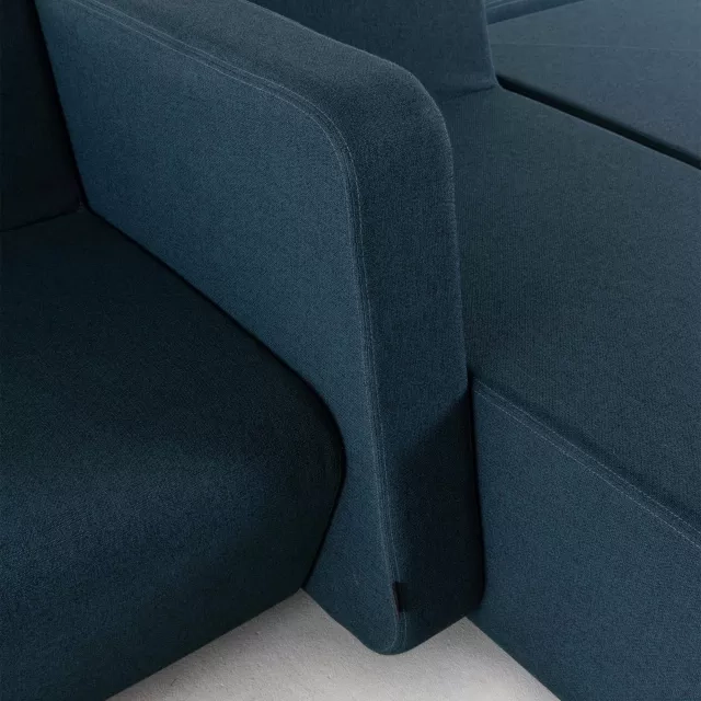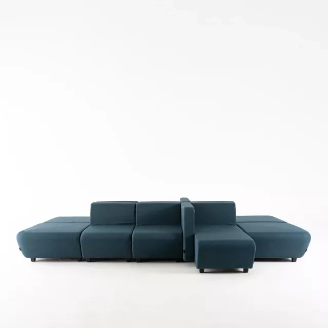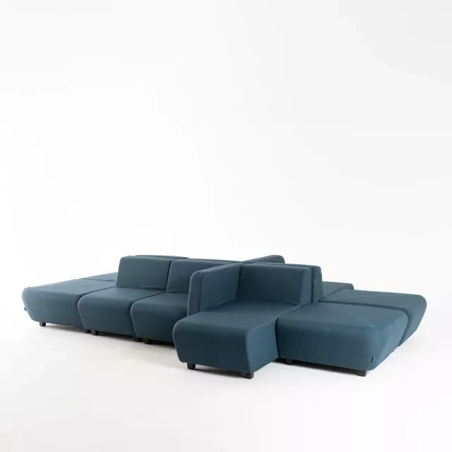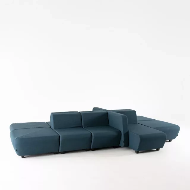 Denne store modulsofa fra Narbutas er brugt og fuldt polstret i et blåt stof. Den passer til virksomhedslounger, receptioner og pausezoner, hvor generøs siddekapacitet og tydelig zoneopdeling er ønskværdige.