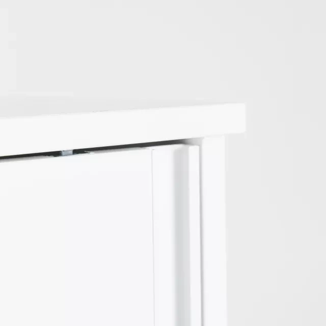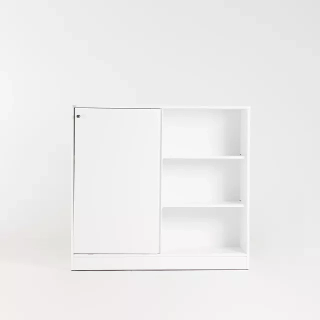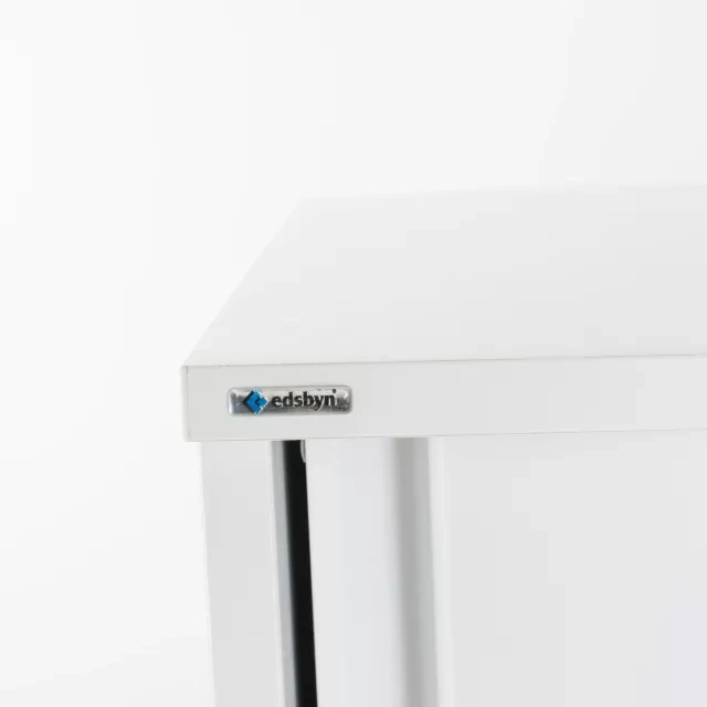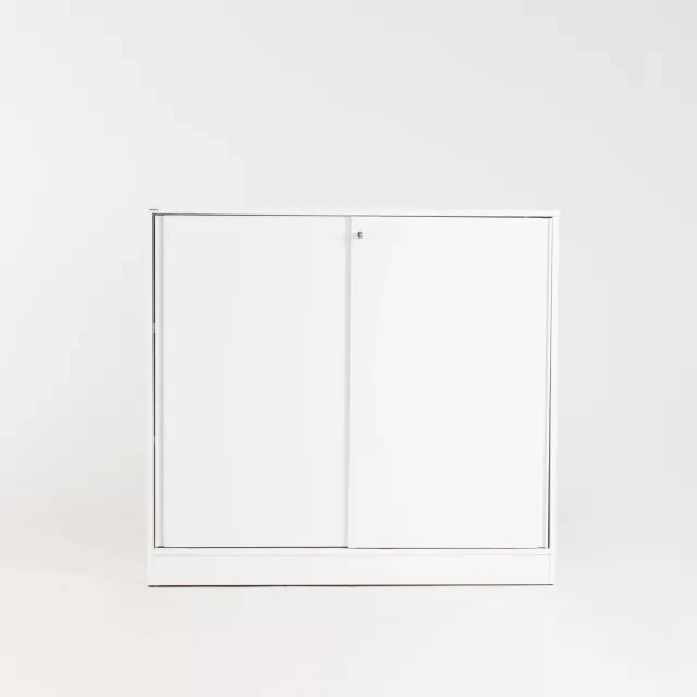 Detta begagnade skåp med skjutdörrar från Edsbyn ger effektiv kontorsförvaring där ytan är begränsad. Skjutdörrarna kräver minimalt utrymme och håller gångar fria i smala passager.