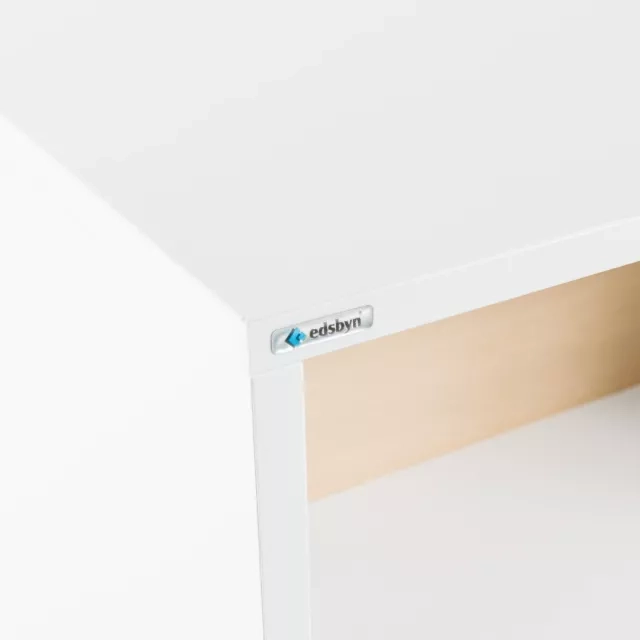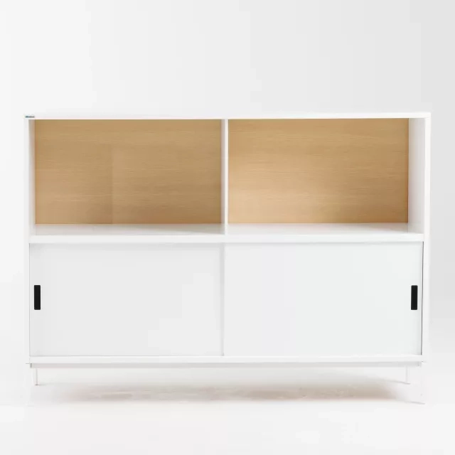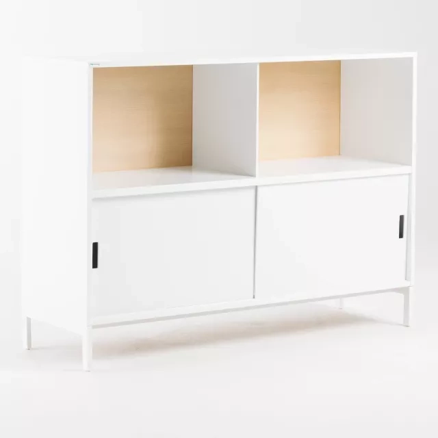 The cabinet Neat from Edsbyn is a reused storage unit that combines open shelves with white sliding doors. This setup provides quick access and secure storage in one piece. Neat is a cabinet by the brand Edsbyn, suitable for offices, receptions and project spaces where order and efficiency matter. Sliding doors require no swing clearance, which simplifies placement near walkways and workstations.