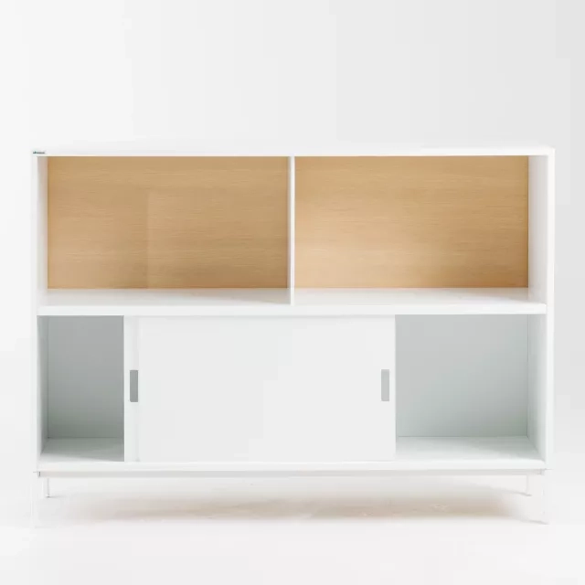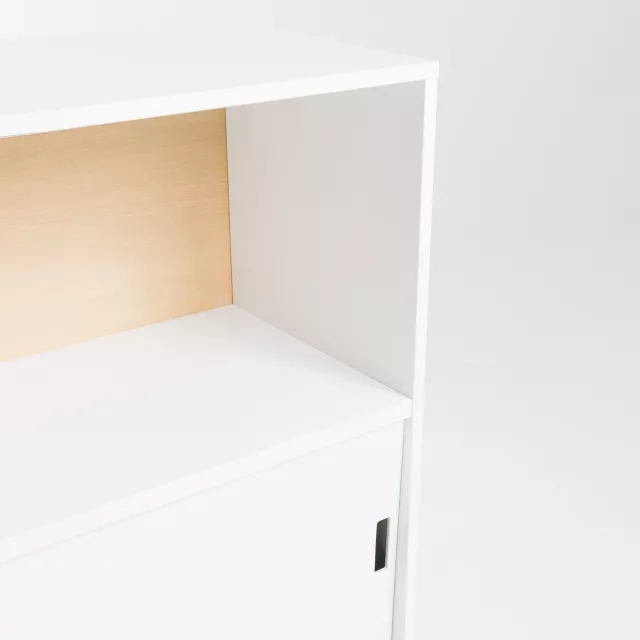 The open shelves suit items that should remain visible and within reach. Behind the sliding doors there is room for binders, IT equipment or personal belongings out of sight. The white front delivers a clean expression that integrates with many interiors. The construction is sturdy and designed for continuous use in professional environments.