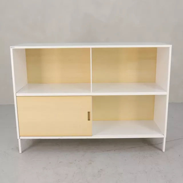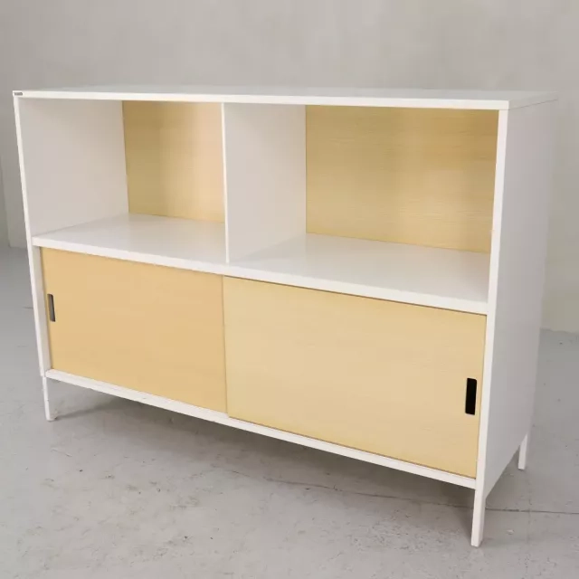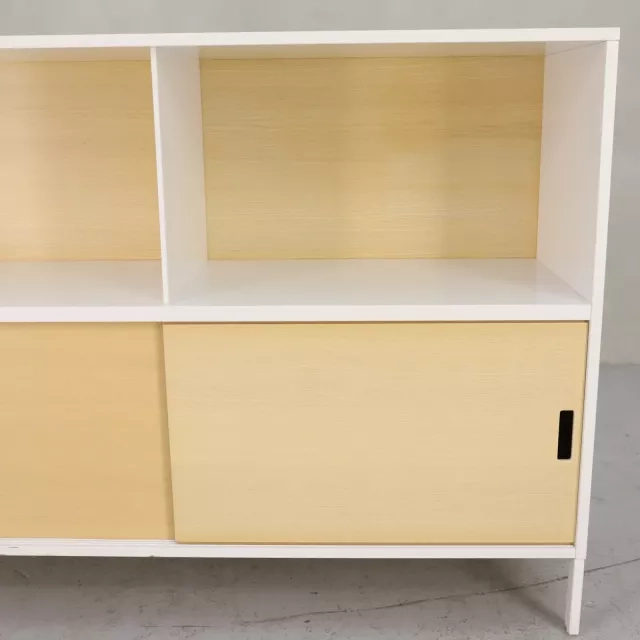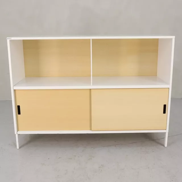 Skåpet Neat 2xA4 från Edsbyn förenar funktionalitet med modern design genom sina öppna hyllplan och skjutbara luckor i askfanér. Detta återbrukade skåp är en mångsidig lösning som passar i olika miljöer och erbjuder förvaring utan att ge avkall på estetiken.