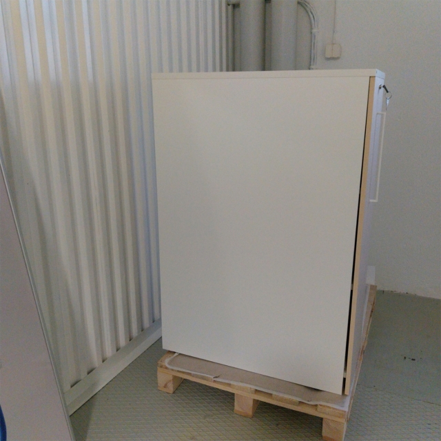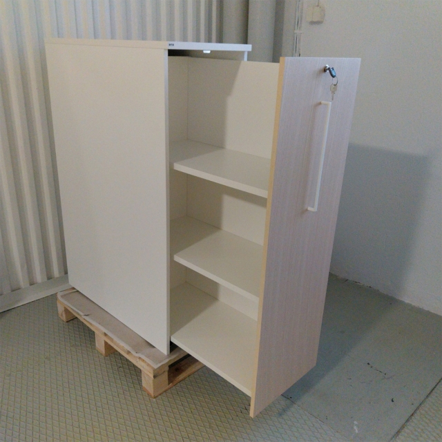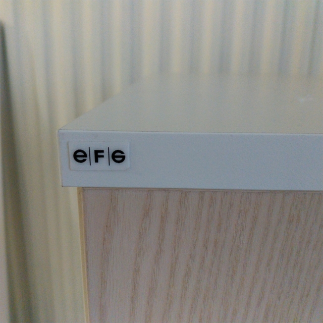 Towerförvaring från EFG. Höger, dvs placeras till höger om skrivbordet sett från sittplats. Stomme i vit laminat. Front i ask.