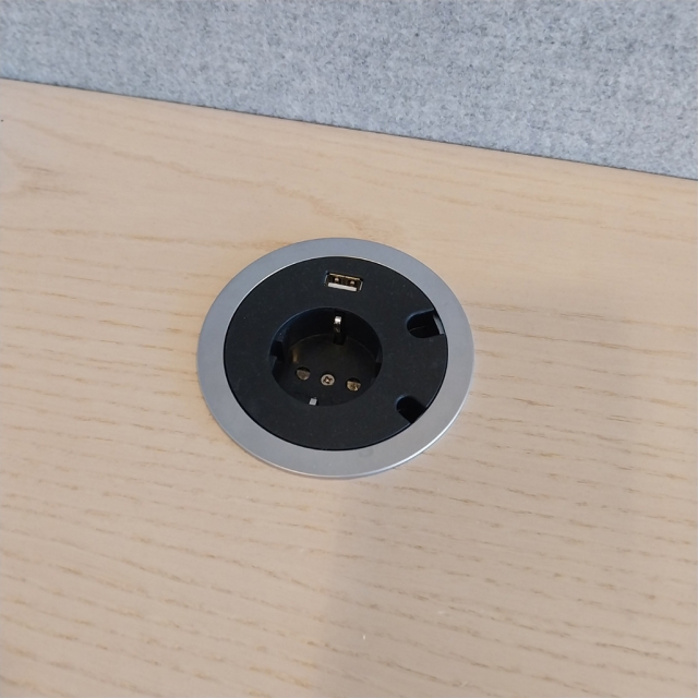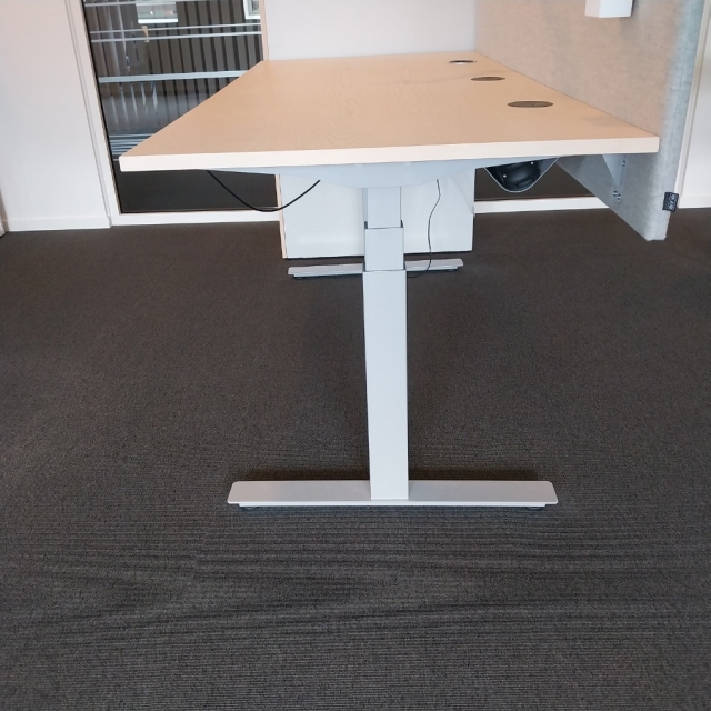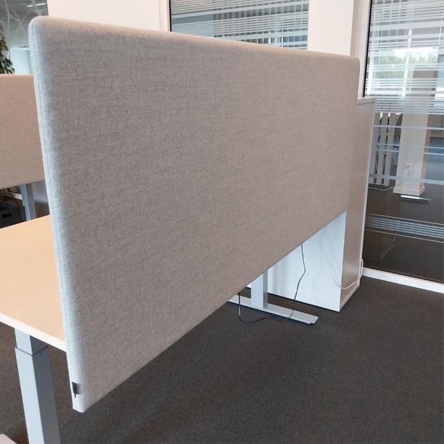 Izi Pro från EFG. Skiva i ask natur. Lackerat metallstativ, silver. Tygklädd bordsskärm, grått tyg. Komplett arbetsplats inkl. funktionslist, kabelränna, monitorarm, uttag, bordsskärm.