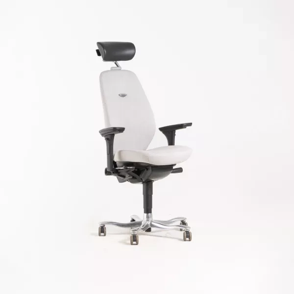Kontorstolen Capisco Puls 8020 fra HÅG med høj gaslift er et genbrugt ergonomisk valg til aktive arbejdspladser. Stolen har hvidt stel og sæde betrukket med gråt stof, designet af Peter Opsvik. Den høje gaslift passer til hæve-sænkeborde og opfordrer til variation i siddestillingen i løbet af dagen. Et godt valg for virksomheder, der vil arbejde mere cirkulært.
