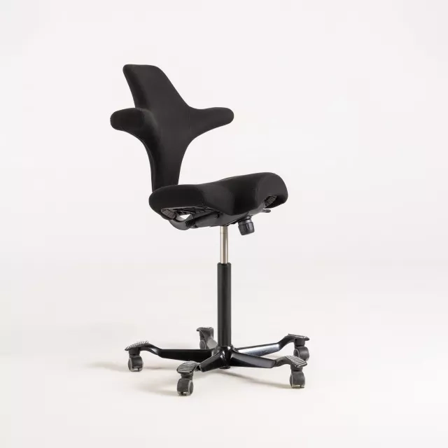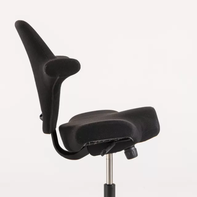 Capisco is an office chair from the HÅG brand that enables varied sitting. The saddle seat opens the hip angle and supports balanced weight distribution. You can shift between upright sitting, forward-oriented work and light perching to change load and maintain alertness. This variation helps reduce static strain and supports concentration during longer tasks.