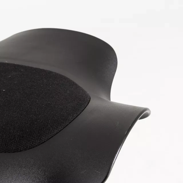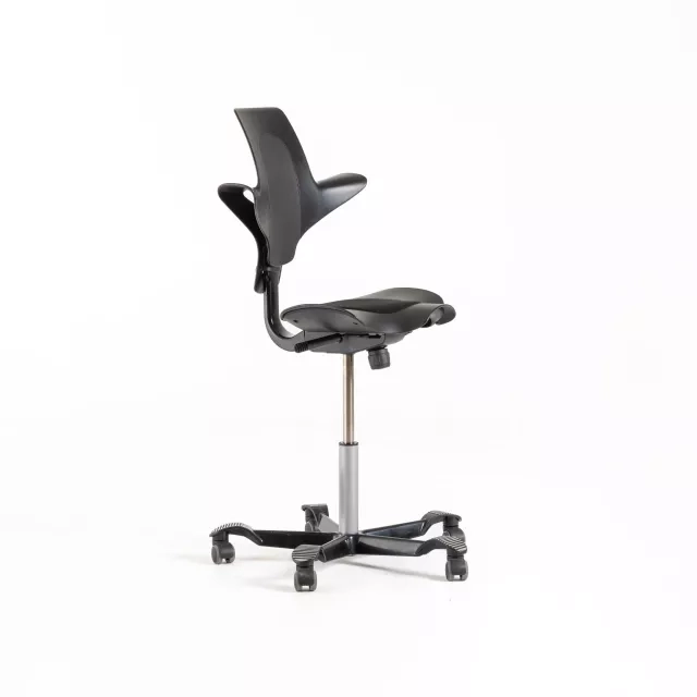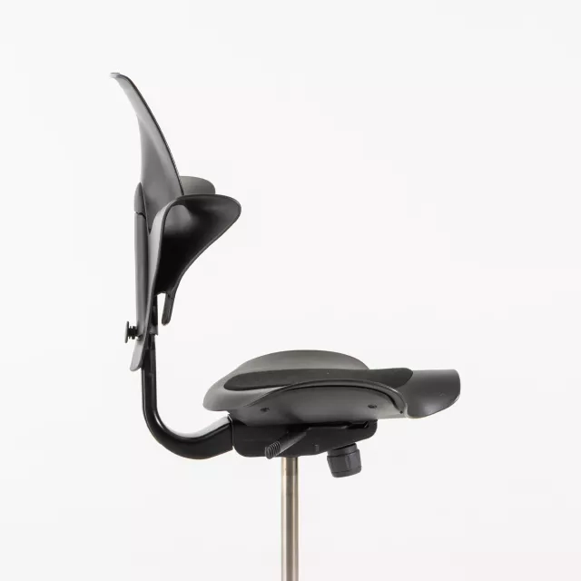 The office chair Capisco Puls 8010 from HÅG is a pre-owned, ergonomic task chair designed for active work. Peter Opsvik created the distinctive saddle seat with an integrated cushion. The seat is upholstered in black fabric for a refined, professional expression. Its sculpted form encourages dynamic posture changes and suits height adjustable desks.