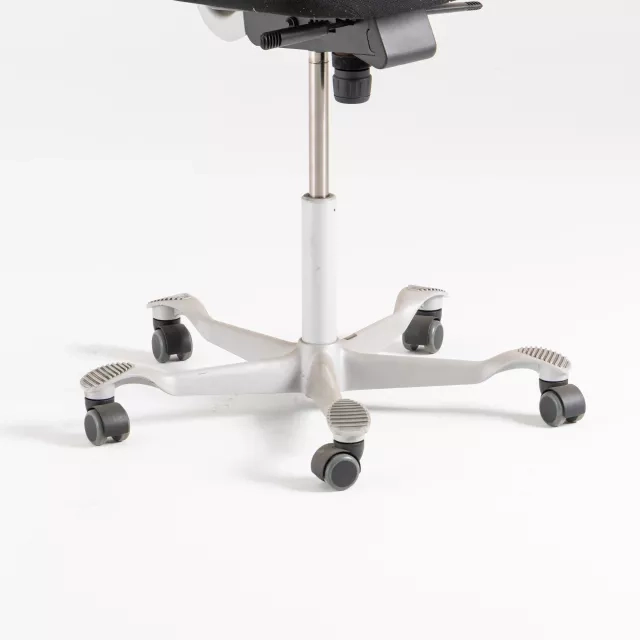 The HÅG H04 4100 office chair is a pre-owned ergonomic task chair designed for professional workspaces. Equipped with a medium gas lift, it offers precise height adjustment for varied desks. The contoured backrest and supportive seat encourage healthy posture during long workdays. A reliable choice for focused individual workstations and shared offices.