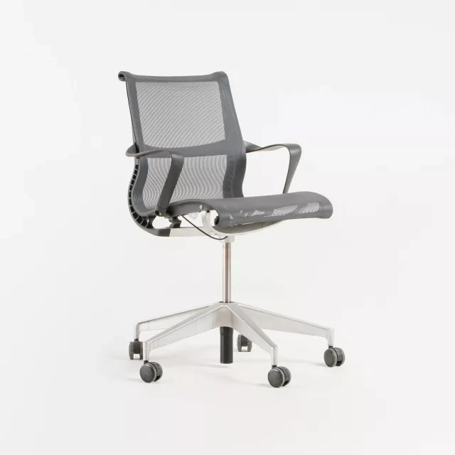 The Herman Miller Setu conference chair on castors brings Studio 7.5’s agile design to meeting rooms and project spaces. This pre-owned model has been carefully refurbished and function tested by our technicians. The responsive backrest and slim profile provide support during longer sessions without adding bulk. A mobile base with smooth-rolling castors keeps collaboration fluid across changing layouts.