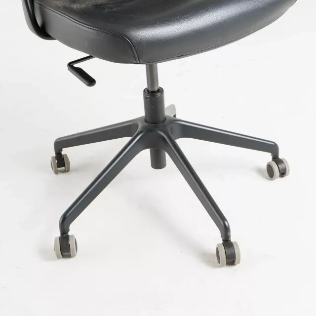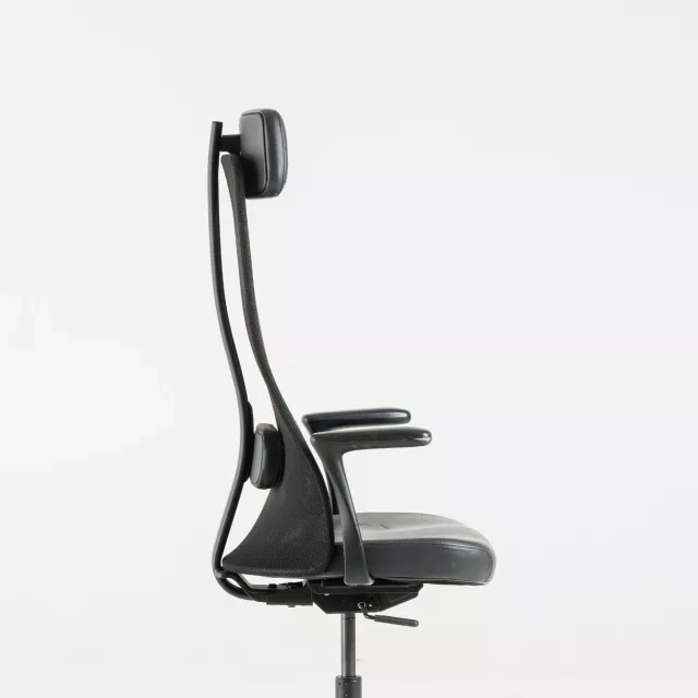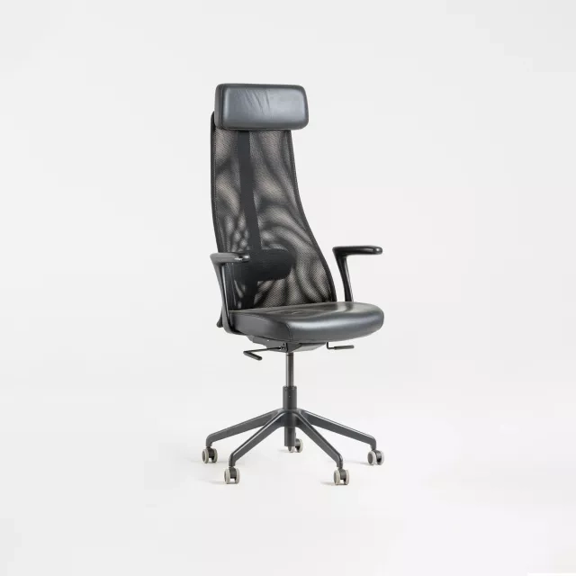 The Järvfjället office chair from IKEA is a reused model prepared for demanding workplaces. Designed by Eva Lilja Löwenhielm, it combines a black leather seat and headrest with a breathable mesh back. This delivers durable seating and a cool, airy feel during long desk sessions. The mesh promotes airflow and helps manage heat during focused tasks. Leather contact surfaces are robust and easy to wipe clean in high-traffic environments.