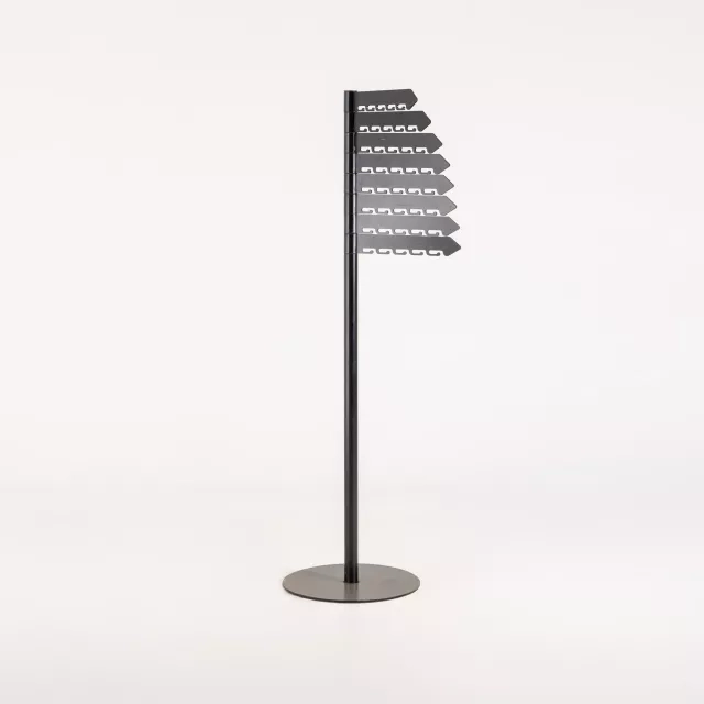 The white lacquer is easy to wipe and resists everyday wear in shared areas. Smooth surfaces help maintain hygiene standards. The free-standing construction keeps coats, jackets and bags organised by entrances or desks. Its compact footprint supports clear walkways, while the neutral colour coordinates with existing furniture and fixtures. It is easy to reposition if floor plans change.