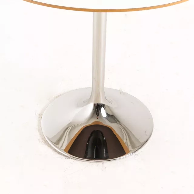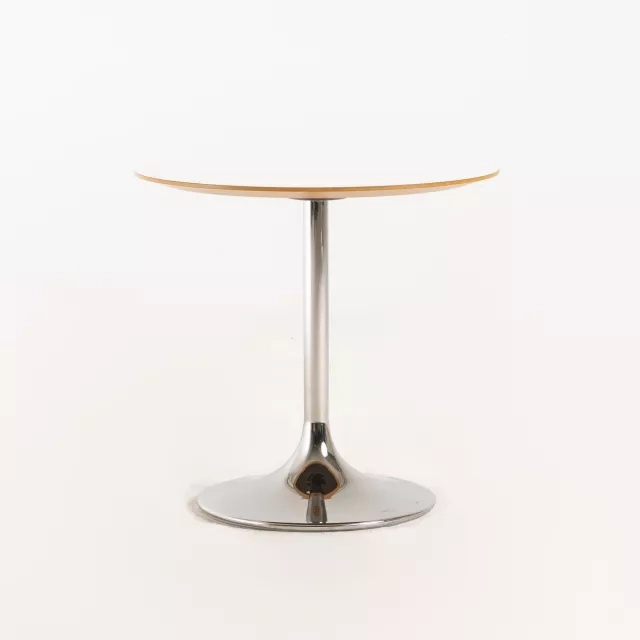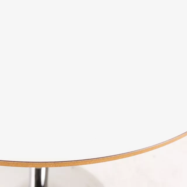 Johanson Design's Venus coffee table is a reused round table featuring the brand's iconic trumpet base with clear Space Age character. The chromed steel base, developed by designer Börje Johanson, pairs with a white MDF tabletop finished in white high-pressure laminate. This combination delivers visual clarity and contract-grade durability for busy workplace settings.