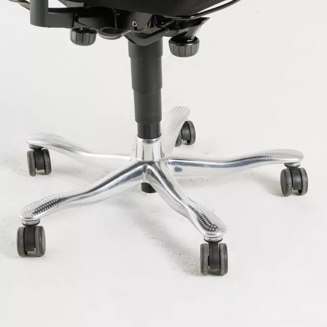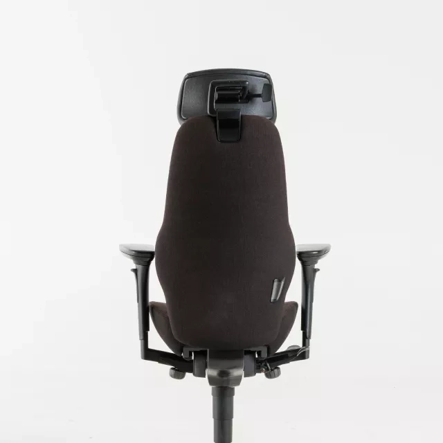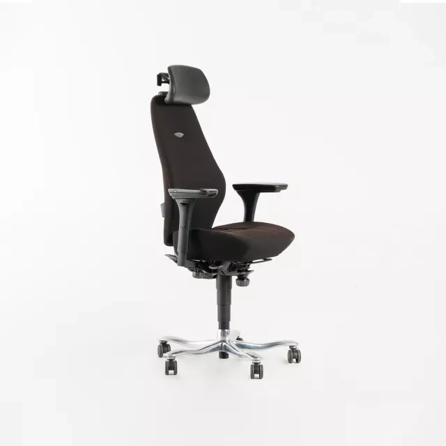 The office chair Plus 6000 from Kinnarps is a refurbished ergonomic task chair designed by Björn Alge. It is fully upholstered in durable black fabric for dependable comfort during long workdays. Adjustable armrests and a supportive headrest help diverse users maintain a healthy posture. As a reused model from Kinnarps, Plus 6 complements modern teams with comfort and resource efficiency.