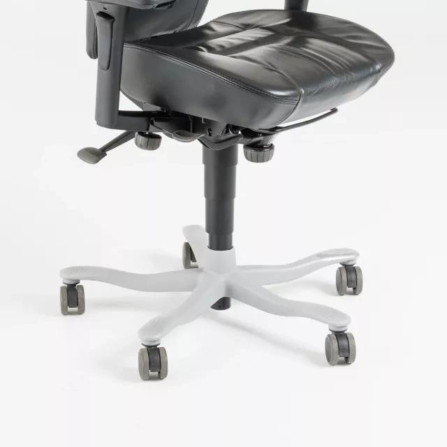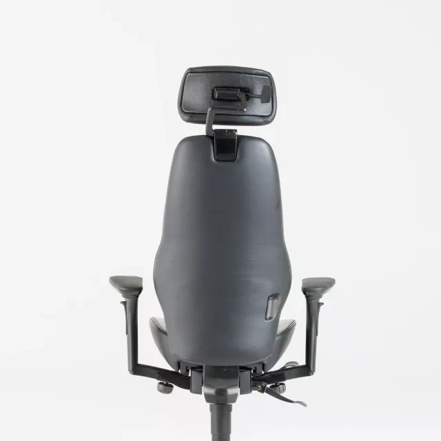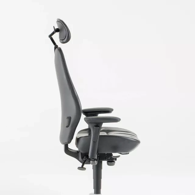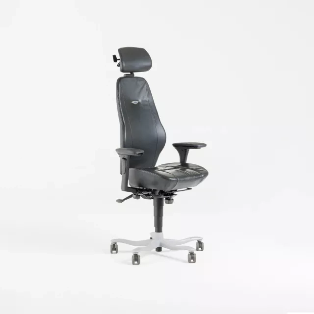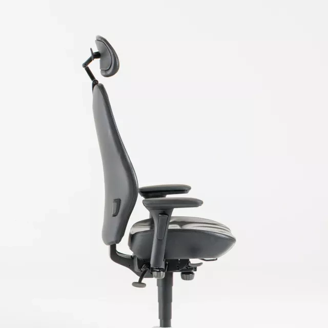 The Kinnarps Plus 8000 office chair has a high back and is fully upholstered in black leather. It features adjustable armrests and headrest, a Synchrone mechanism and a height adjustable seat. Designed by Johan Larsvall and Torbjörn Höjer. This pre-owned Kinnarps Plus 8000 provides ergonomic support during demanding workdays. The Synchrone mechanism encourages natural movement and a balanced posture through long sessions. The high back and padded headrest add comfort for focused tasks and video meetings. Durable leather suits intensive use in corporate environments. Each chair is inspected by our technicians to secure consistent function for circular office projects. Kinnarps Plus 8000 works well for individual workstations, control rooms and shared desk areas.