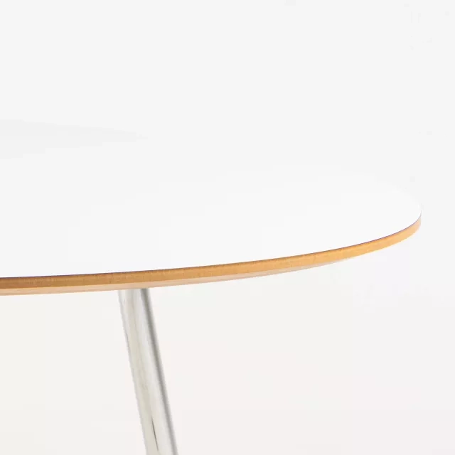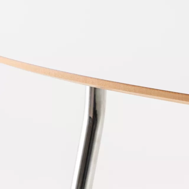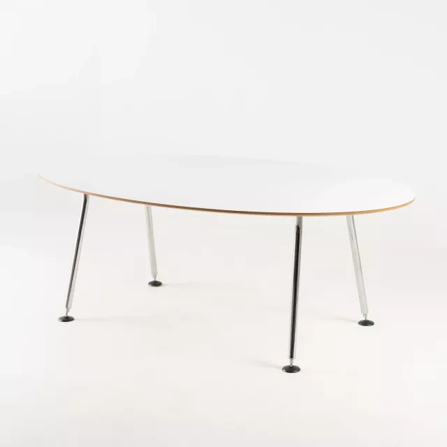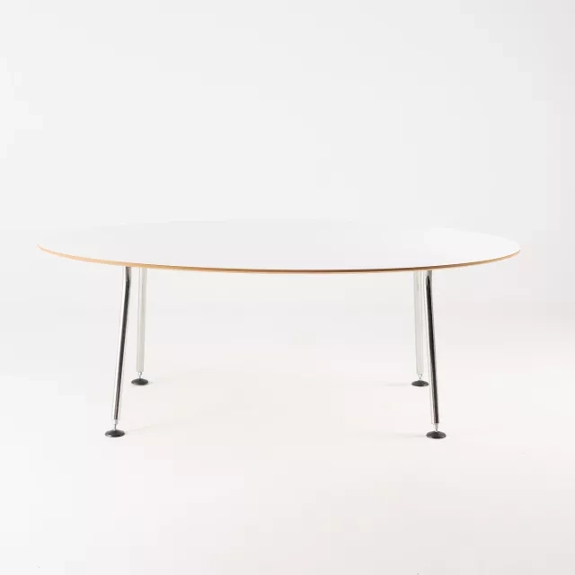 This repurposed conference table features a robust tabletop made from white high-pressure laminate, supported by a sturdy MDF core. The chrome-plated steel frame not only adds a touch of elegance but also ensures durability, making it suitable for long-term use in professional settings. Its sustainable design meets the needs of any modern office looking to combine functionality with a commitment to the environment.