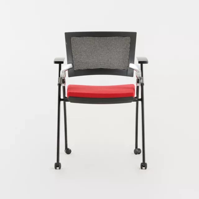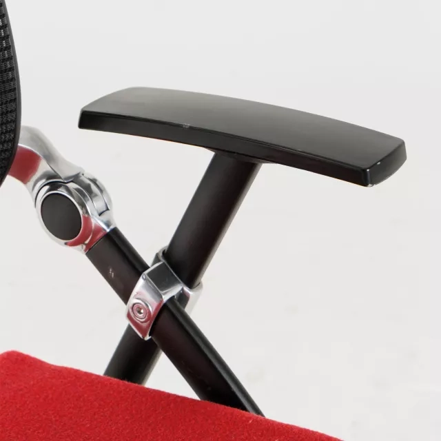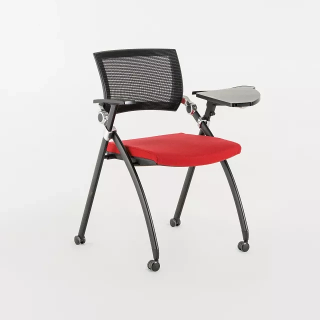 The conference chair Vega with integrated writing tablet is a practical solution for training rooms, auditoriums and agile meeting spaces. This pre-owned model supports note taking and laptop work without extra tables, which helps optimise floor space and seating density.