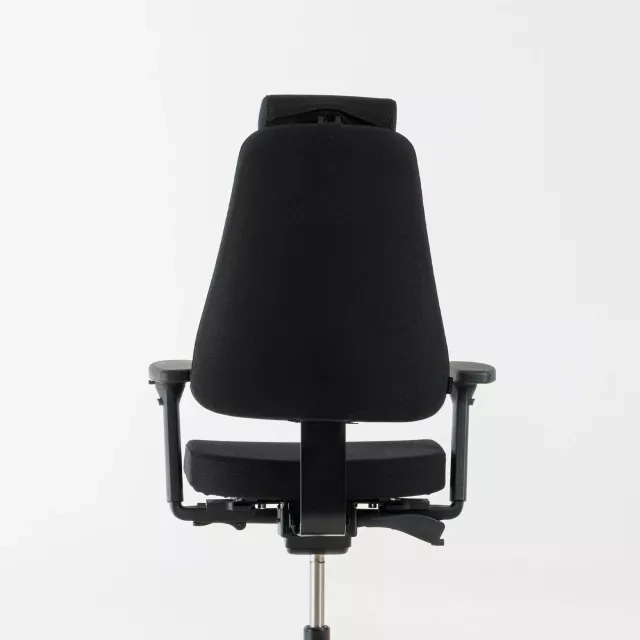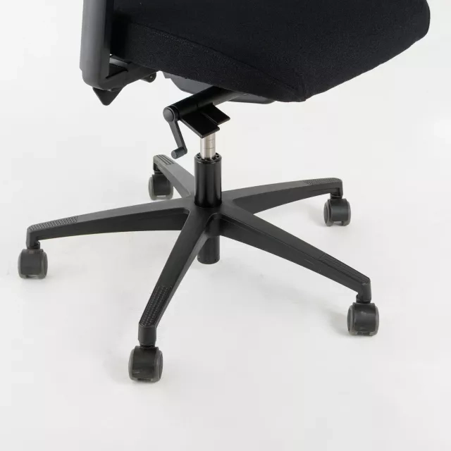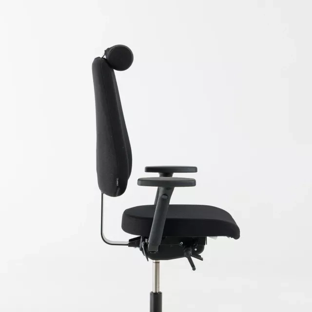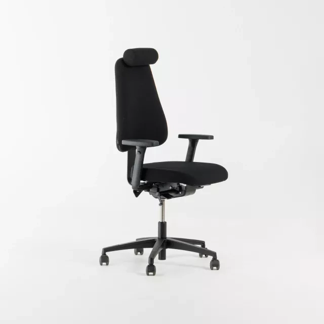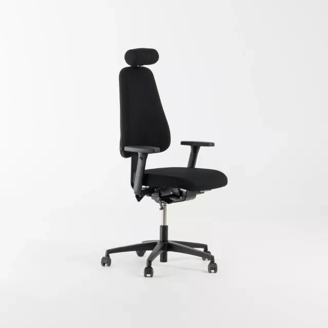 The Lanab Design LD63 office chair is a Swedish-made ergonomic task chair with high build quality for professional workspaces. This pre-owned model is fully upholstered in black fabric and includes armrests and a headrest. LD63 from Lanab Design delivers stable support for focused work and meetings across the office. The durable upholstery suits intensive use in offices, public environments, and project spaces. Choosing a reused LD63 reduces environmental impact while maintaining reliable quality for your team. The chair works well for single workstations, touchdown areas, and shared hubs in modern offices.