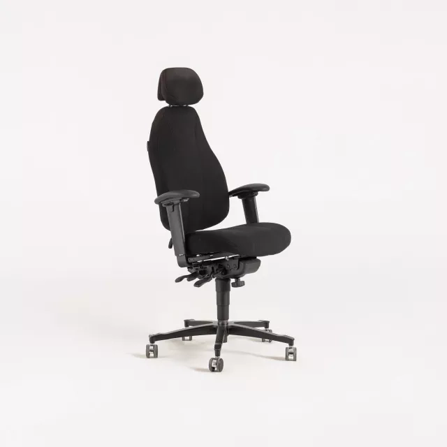 The Malmstolen Classic 4000 office chair is a Swedish-made ergonomic task chair designed for professional environments. It is fully upholstered in durable black fabric that handles daily use. With high build quality, it suits a wide range of users and roles. It provides consistent support during full working days.