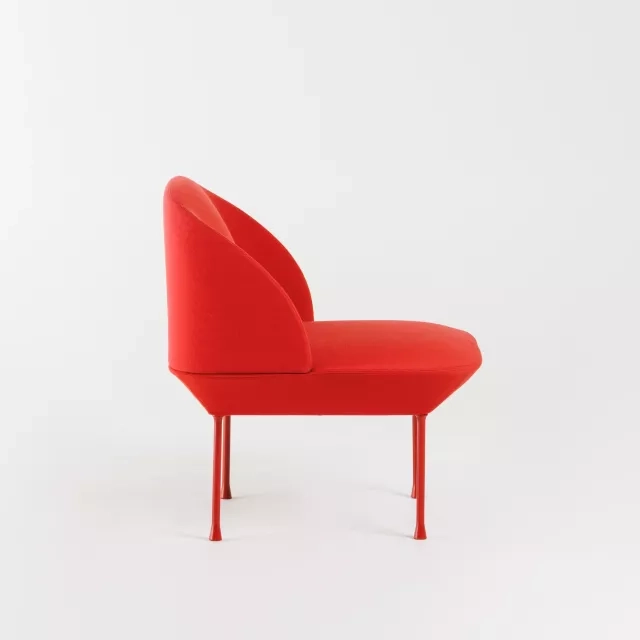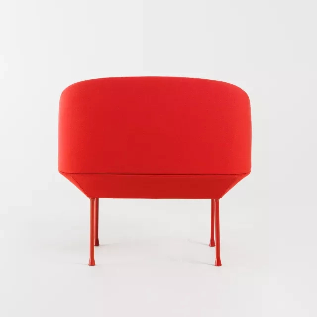 The Oslo armchair from Muuto delivers a refined seat for lounges, receptions and meeting points. This reused piece is upholstered in red Steelcut by Kvadrat for high durability and colour consistency. Red lacquered steel legs give a clean, minimalist expression that integrates easily in contemporary schemes. Designed by Anderssen & Voll for Muuto, Oslo combines comfort with a compact footprint that saves space. Robust materials support frequent use in professional environments and simplify long term maintenance. The Muuto Oslo armchair supports circular procurement goals while keeping a coherent aesthetic and reliable seating comfort.