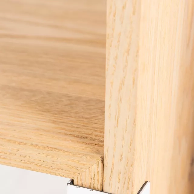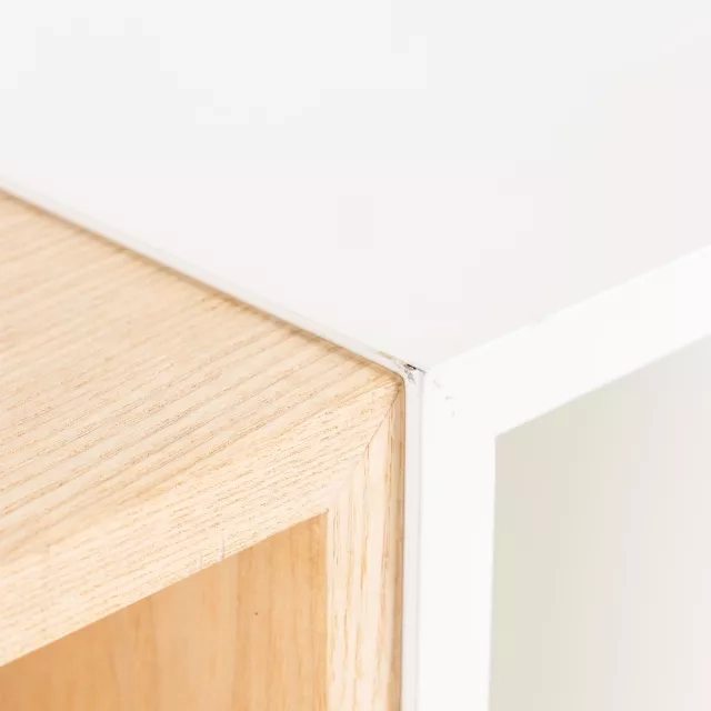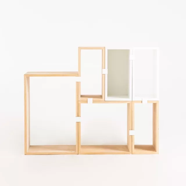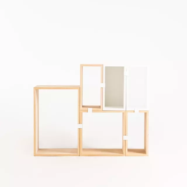This reused combination of the Muuto Stacked shelving system delivers adaptable storage for modern workplaces. Designed by Julien De Smedt in 2008, it balances clarity with modular freedom. The modules are crafted in white MDF and oak veneer for a clean Scandinavian expression. The Stacked shelf from Muuto suits offices, studios, reception areas and collaborative zones. Use it to structure archives, sample libraries or display areas with a coherent visual rhythm.