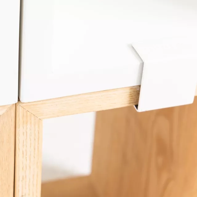 Stacked by Muuto integrates easily with existing furniture and branding palettes. The calm mix of white surfaces and warm oak assists wayfinding and visual order. Choose this modular shelving system when you need dependable office storage with a low environmental footprint.