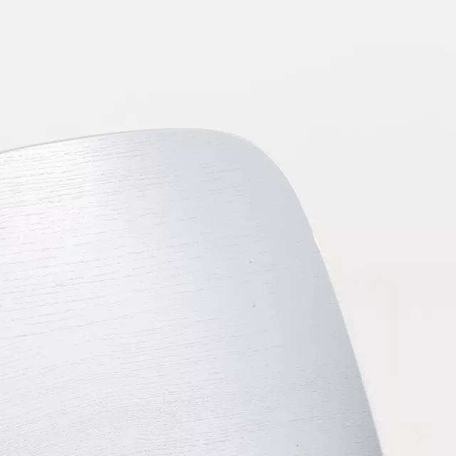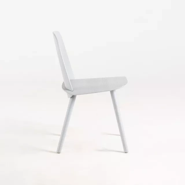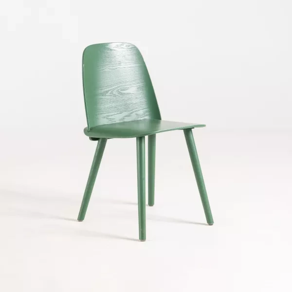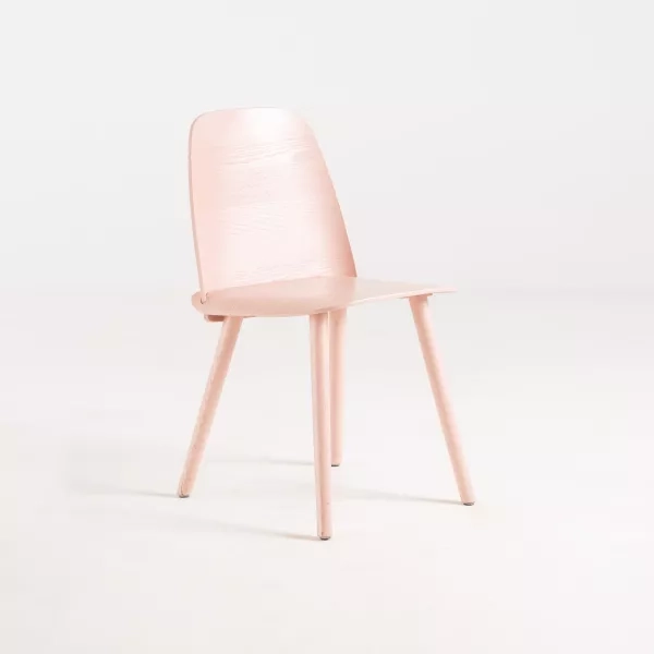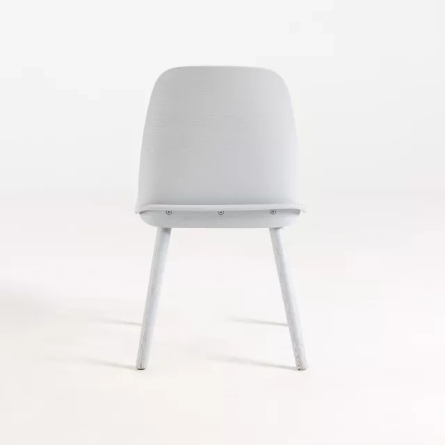 The Nerd chair from Muuto is a pre-owned Scandinavian design by David Geckeler for dynamic professional interiors. A form-pressed veneer backrest and seat deliver a slim profile with dependable strength. Solid wood legs add stability and a tactile material presence. This example is finished in lacquered ash for a uniform look and added protection. The distinctive junction between seat and back gives Nerd a recognisable character that reads well in branded spaces.