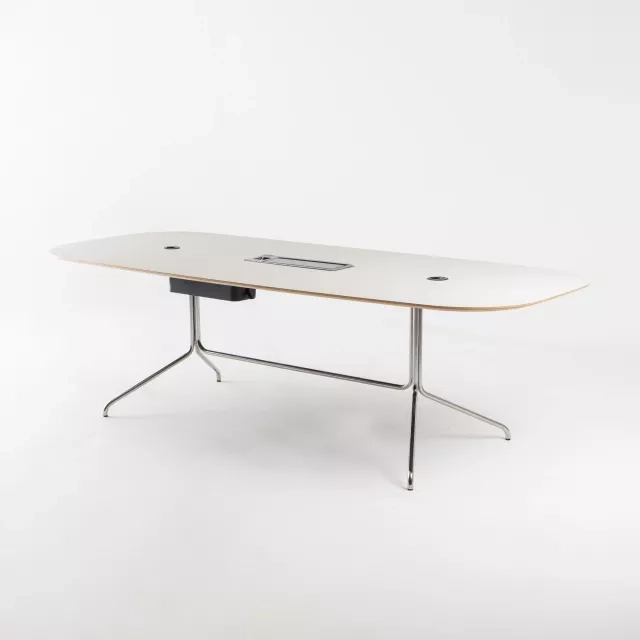Konferensbordet Bond från Offecct, designat av Jean-Marie Massaud, utgör ett sofistikerat tillskott i varje modern kontorsmiljö. Bordsskivan i Forbo Desktop Vapour med plywoodkärna erbjuder både slitstyrka och samtida stil. Utrustad med strömbox och strömdots, möjliggör det smidig uppkoppling och funktionalitet för alla mötesbehov.