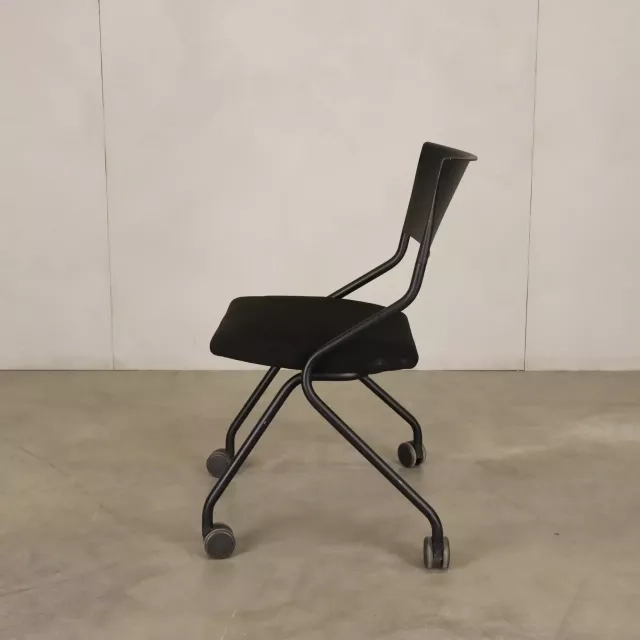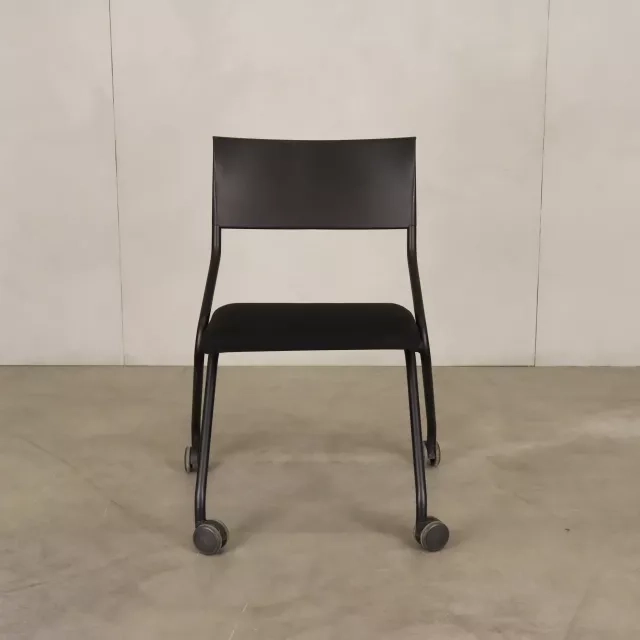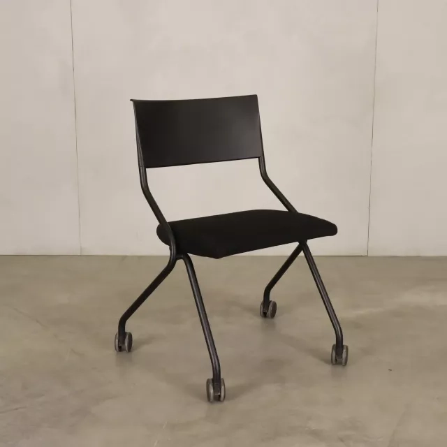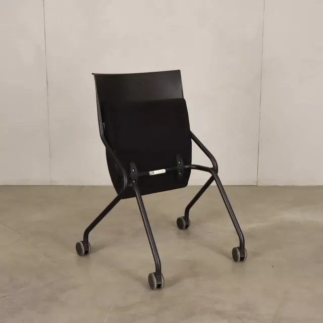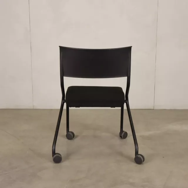 Konferencestolen Flip Flap på hjul fra Sedus, skabt af det prisbelønnede tyske studie designship, er en fremragende tilføjelse til dynamiske miljøer. Denne genbrugte mødestol er både sammenklappelig og udstyret med hjul, hvilket gør opbevaring og transport enkel og passer til miljøer, der kræver hurtig opsætning og nedtagning, eksempelvis mødelokaler og konferencerum. Stolen har et polstret sæde betrukket med sort stof, hvilket giver komfort og et sofistikeret, professionelt udtryk.