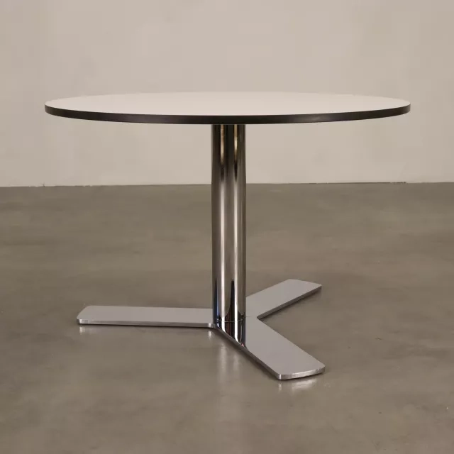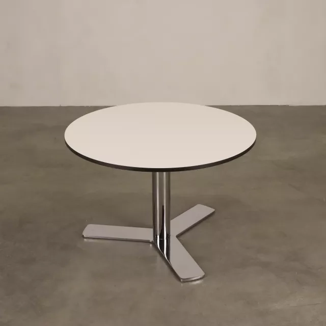 This reused round coffee table is a clean, durable choice for reception areas, lounges and meeting zones. It features a white HPL top on an MDF core with black edge banding, and a chrome-plated steel frame for stability.