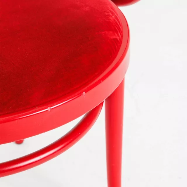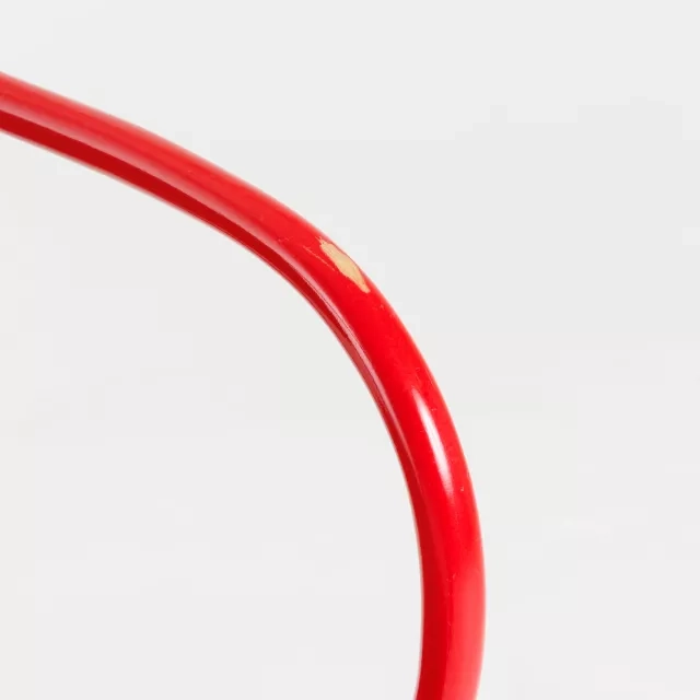 Stolen framstår med visst slitage i form av repor och färgnagg på den röda lacken. Sitsen är klädd i rött tyg och uppvisar färgskiftningar. Observera dessa visuella bruksspår vid planering av placering och antal.