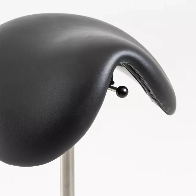 Tämä ergonominen satulatuoli on suunniteltu parantamaan mukavuutta ja tukea erilaisissa ammatillisissa ympäristöissä, kuten terveydenhuollossa ja kouluissa, tai toimimaan lisätoimistotuolina. Sen korkeussäädettävä ja kallistettava istuin, joka on verhoiltu kestävällä mustalla keinonahalla, tukee hyvää ryhtiä pidempien työjaksojen aikana.