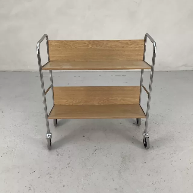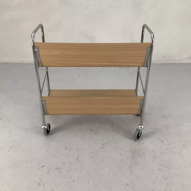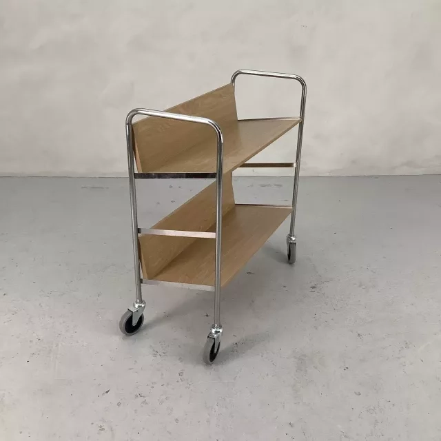 Tämä pyörillä varustettu, tammesta valmistettu kirjavaunu tarjoaa toiminnallisen ja pelkistetyn ratkaisun kirjojen järjestämiseen toimistossasi. Kromattu alusta pyörillä varmistaa sulavan liikuteltavuuden ja yhdistää käytännöllisyyden eleganttiin muotoiluun.