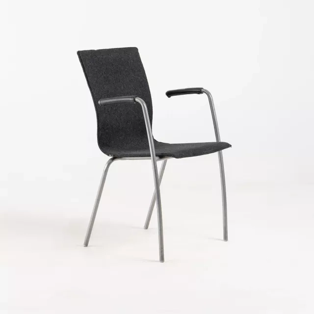 EFG:n Sit-käsinojatuoli on ympäristöystävällinen vaihtoehto, valmistettu kestävästä viilusta ja tukevasta metallirungosta. Se on kauttaaltaan verhoiltu harmaalla huopakankaalla ja sen siro, pelkistetty muotoilu sopii erilaisiin ammatillisiin ympäristöihin. Vaikka tuoli on käytetty, siinä on vain vähäisiä käytönjälkiä, kuten painaumia ja naarmuja käsinojissa, mikä tekee siitä käytännöllisen valinnan niille, jotka etsivät kestäviä toimistoratkaisuja.