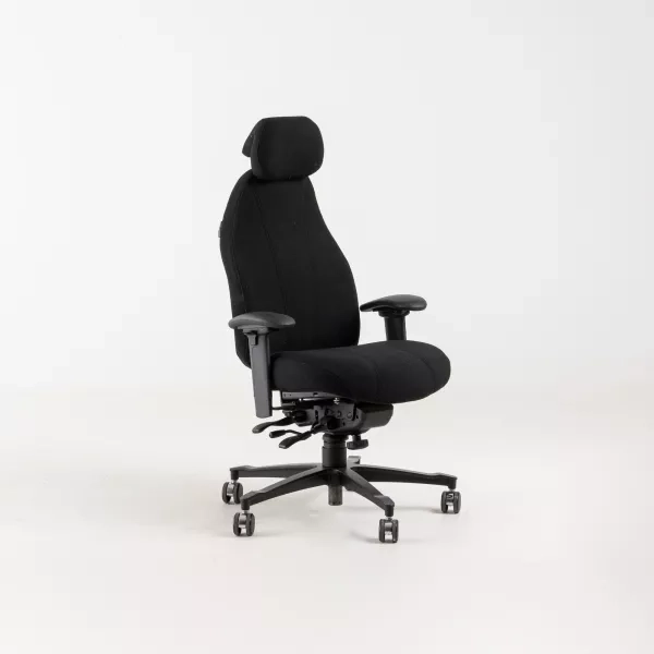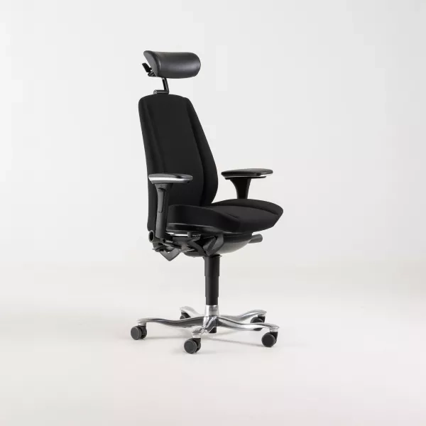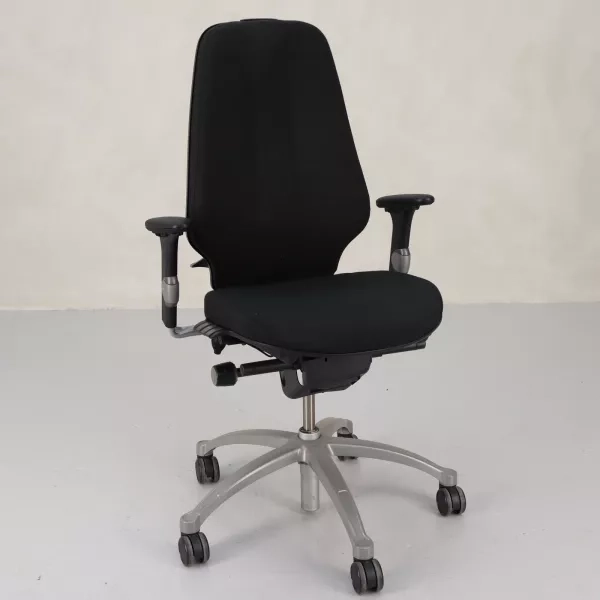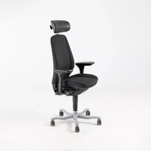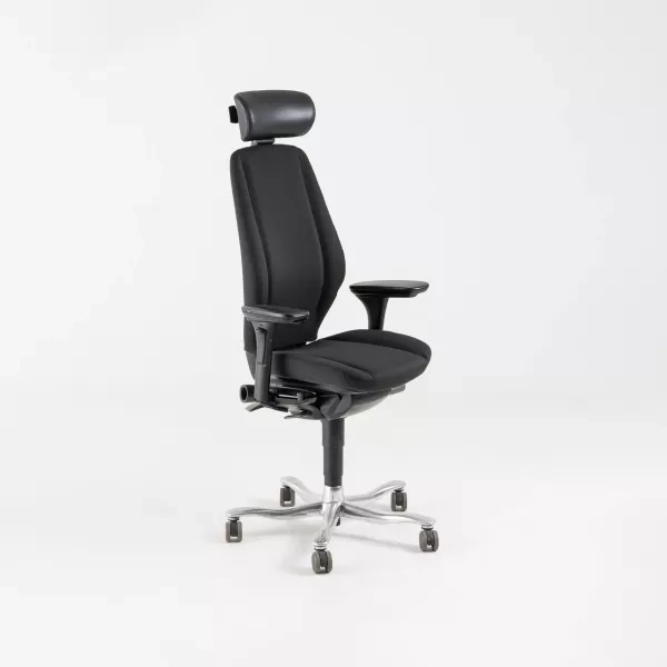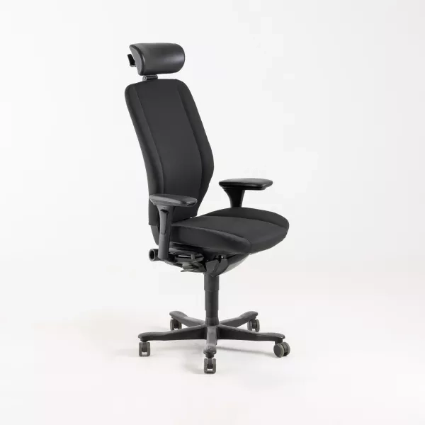 Ergonominen Kinnarps 9000 -työtuoli on vastikään kunnostettu ja uudelleen verhoiltu mustalla kankaalla. Säädettävillä käsinojilla ja mustasta nahasta valmistetulla niskatuella varustettuna tämä tuoli edistää hyvää ergonomiaa monipuolisten säätömahdollisuuksiensa ansiosta. Sopii kaikkiin toimistoympäristöihin, joissa arvostetaan mukavuutta ja kestävyyttä.