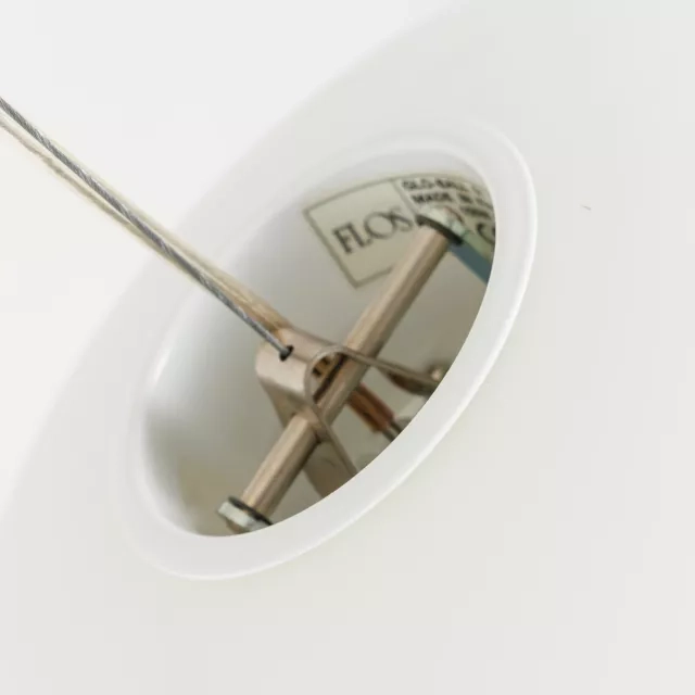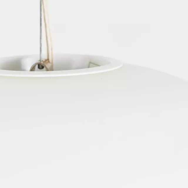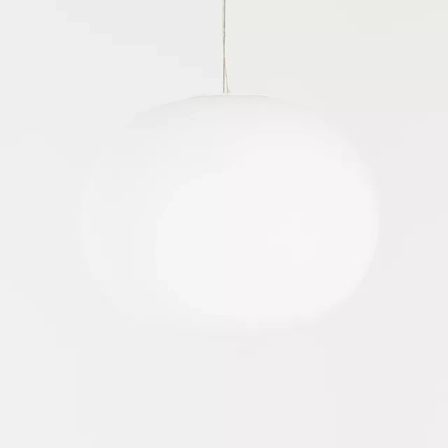 Taklampan Glo-Ball S2 från italienska Flos, formgiven av Jasper Morrison 1998, ger mjukt och jämnt ljus i professionella miljöer. Denna begagnade pendel har en handblåst opalglaskupa som sprider behaglig allmänbelysning över bord och öppna ytor.